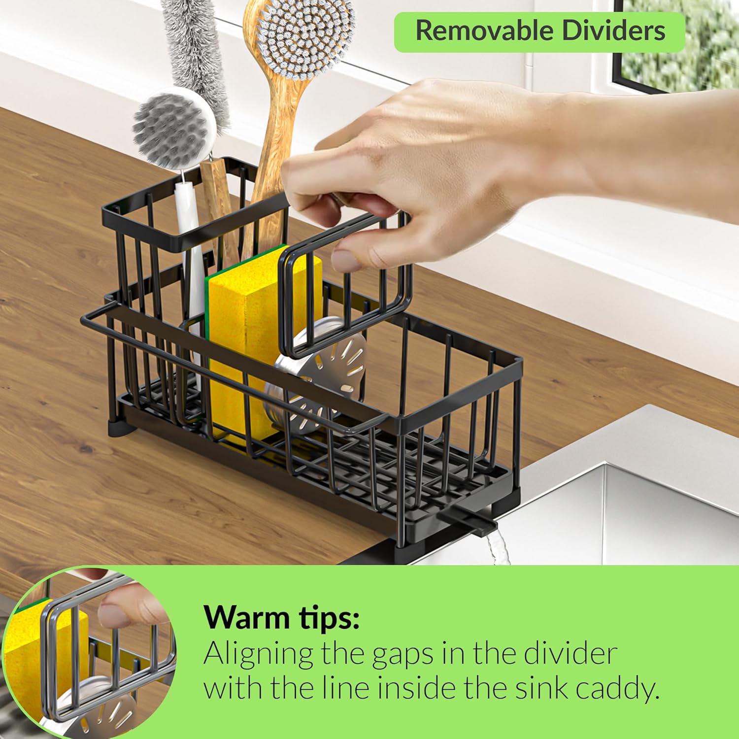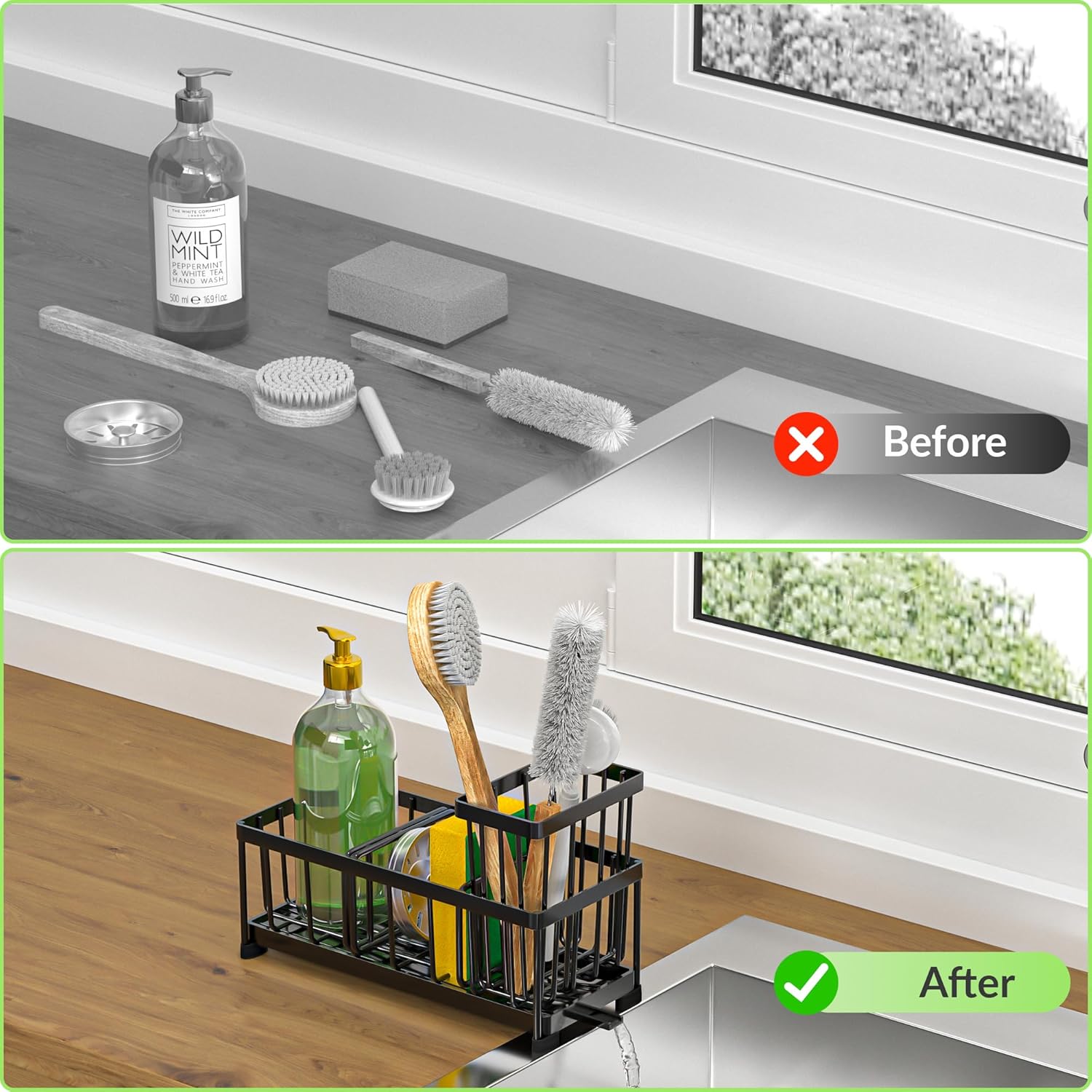 - 【No Installation Required】Our Sink Caddy is ready to use- straight out of the box without any installation requirements, This kitchen sink organizer fits into any kitchen decor, offering a sleek and functional solution.