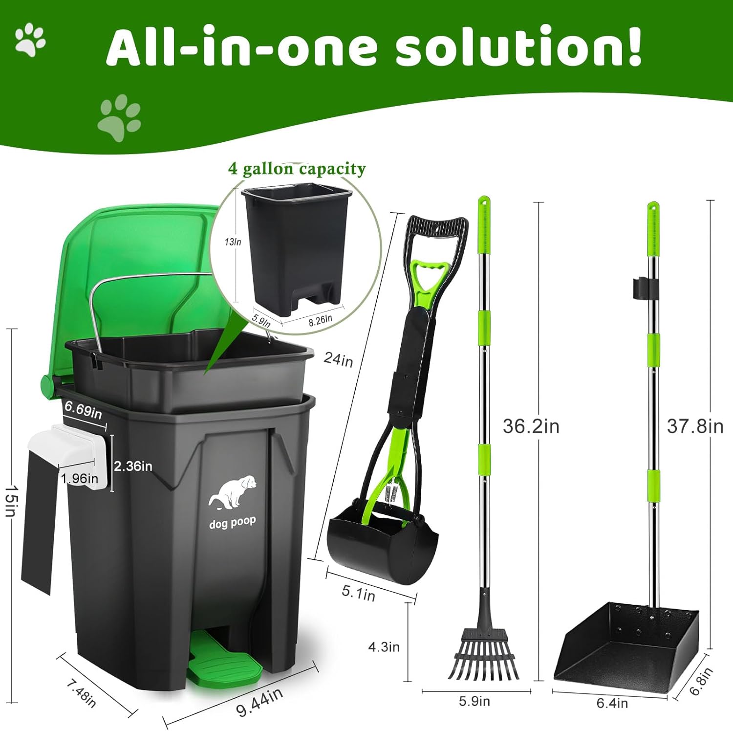 - Product Includes: A fully assembled 20L outdoor dog poop trash can with lid,and a 4 gallon Inner Waste Bin; You will also receive a metal rake & tray, a foldable Pooper Scooper, a bag organiz box and 100 durable dog poop bags