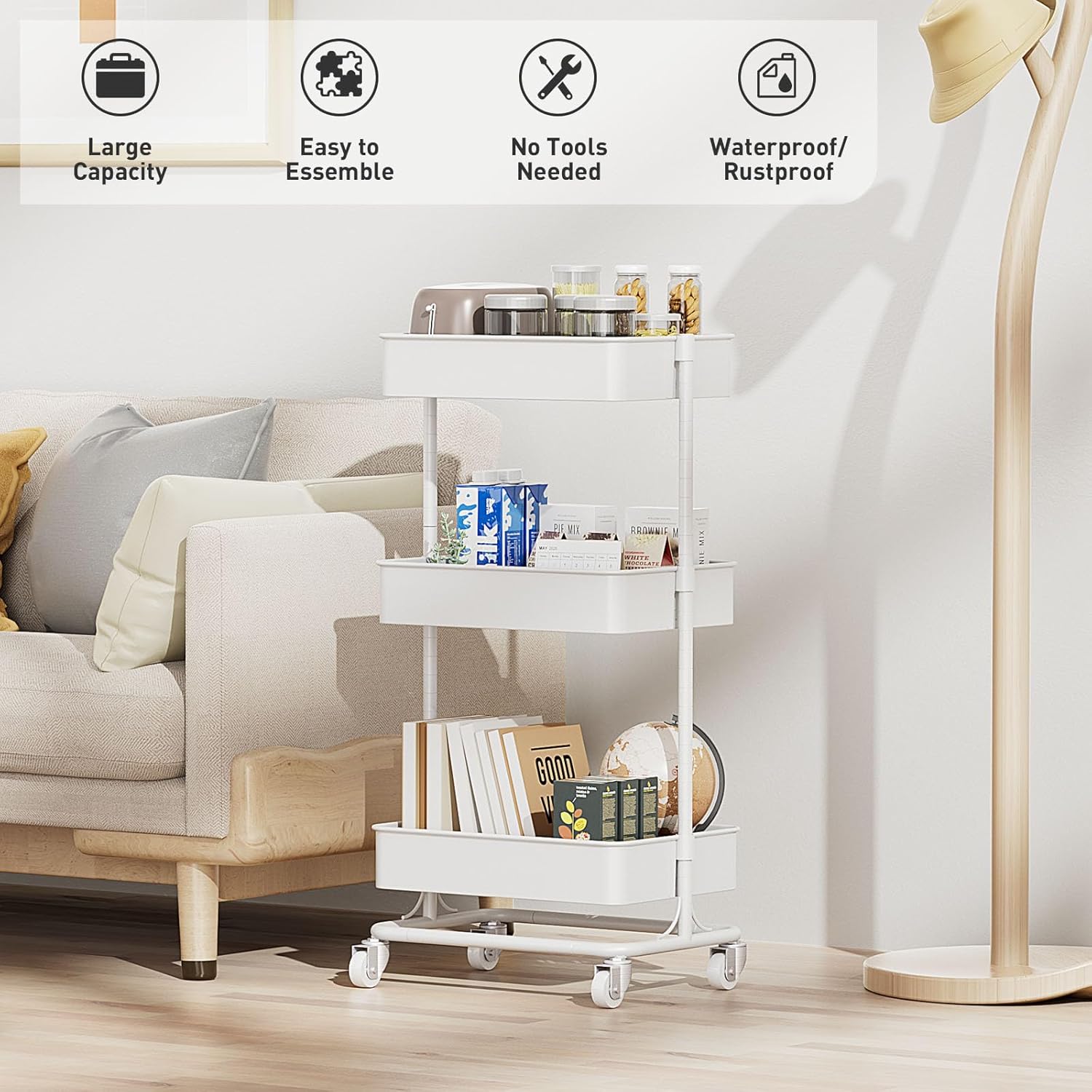 3 Tier Modern Metal Rolling Tool Cart with Silent Casters, 17.72×12.40×35.04 inch Heavy Duty Organization Truck Trolley Organizer for Office, Living Room, Kitchen, (White)