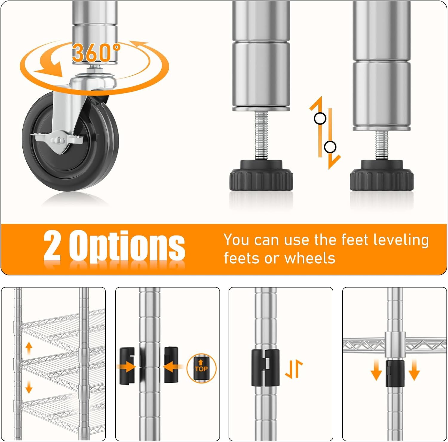 - 【ADJUSTABLE SHELF】Each layer of the wire shelf can be adjusted to match the height of your items, optimizing your storage space. Additionally, you can join two storage racks to form a wider unit, providing extra width to meet your needs.No matter your requirements, you can assemble a shelf configuration that fits just right