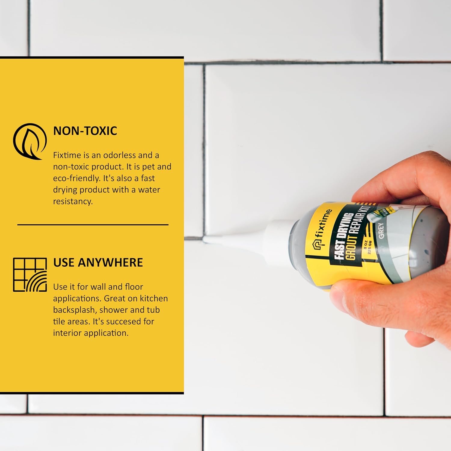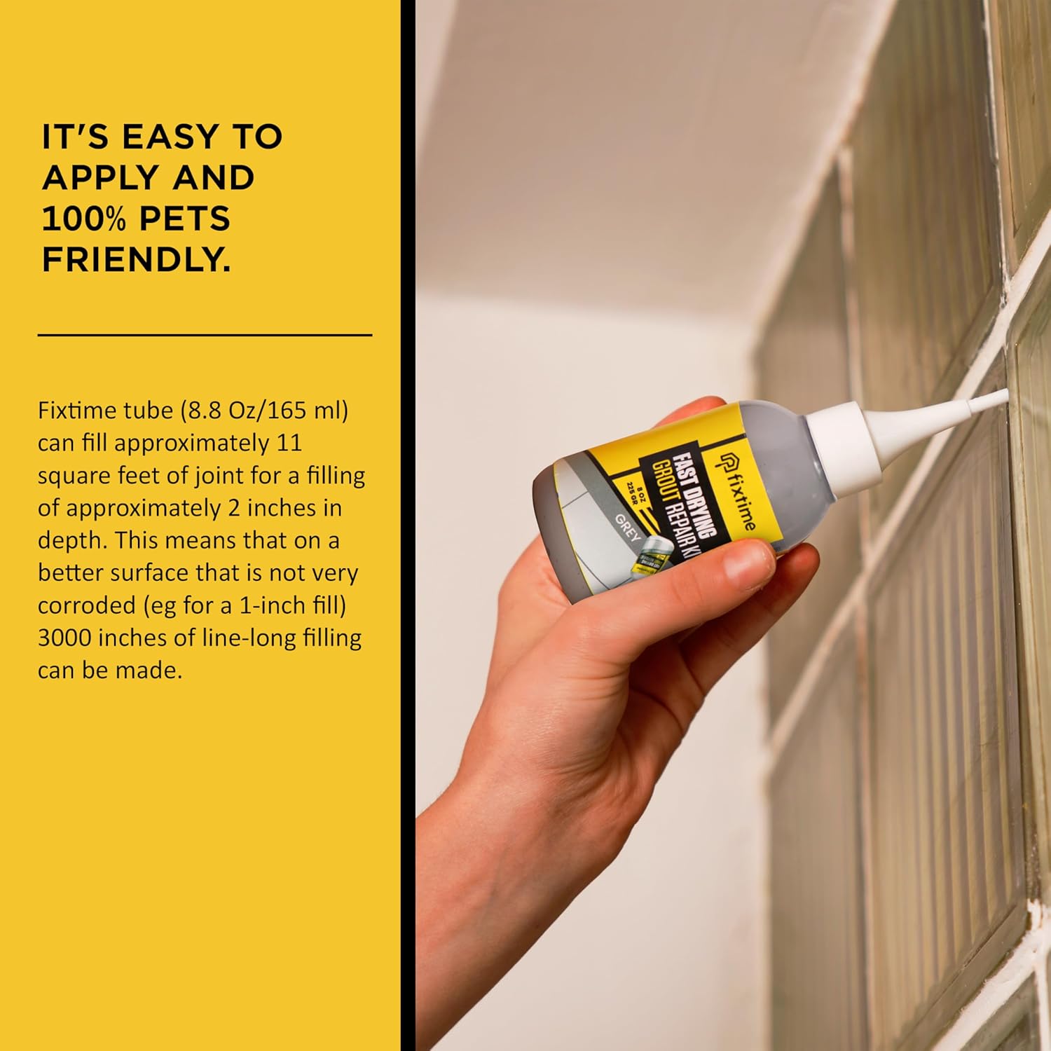 - EASY USAGE: It's fast drying formula; therefore, it's easy to apply and 100% pets friendly. Both DIY and professional friendly in only takes a warm pail of water, sponge and paper towel along with Fixtime. Always clean the area first then dry the entire area fully. Apply the desired amount of Fixtime to the intended area. Spread the Fixtime evenly by using our squege like a back side of trowel. Make sure there is no gap or bubling left throughout your grout joints.