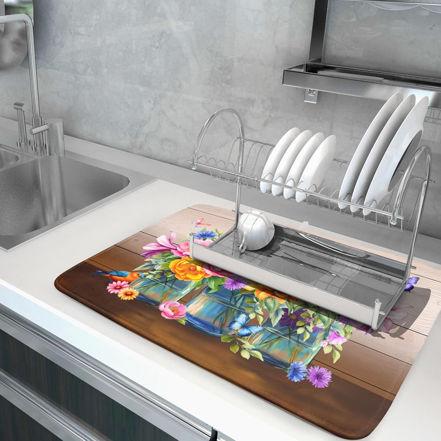 Spring Flowers Dish Drying Mat for Kitchen Counter 18x24in Vintage Plants Colorful Floral Kitchen Drying Mat Soft Absorbent Microfiber Farmhouse Flowers Dish Drainer Rack Mats for Kitchen Countertops