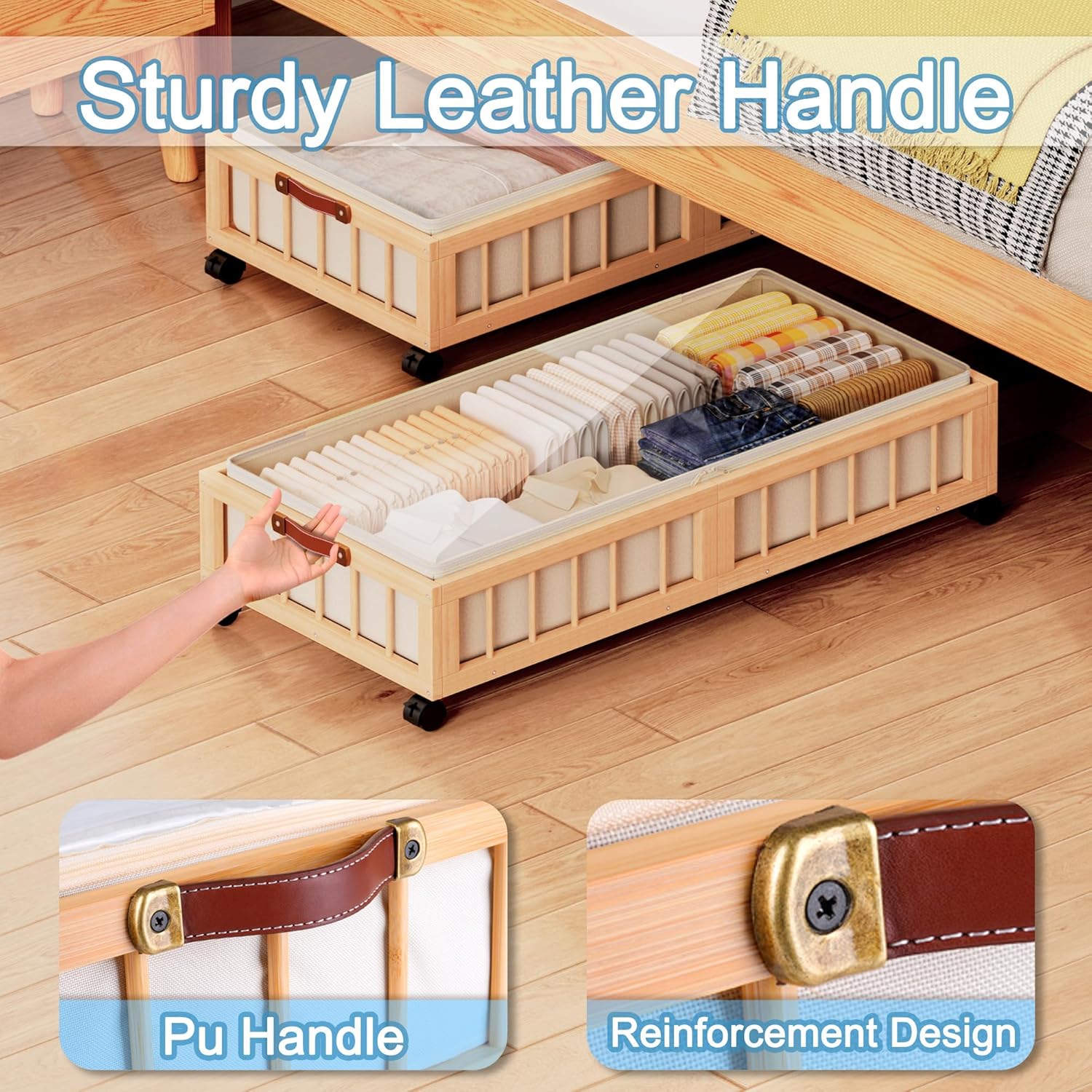 - 【Sturdy Leather Handle】 The under-bed storage basket features a leather handle, making it easy to pull out from under beds, sofas, or tables. The durable leather ensures a comfortable grip and smooth handling.