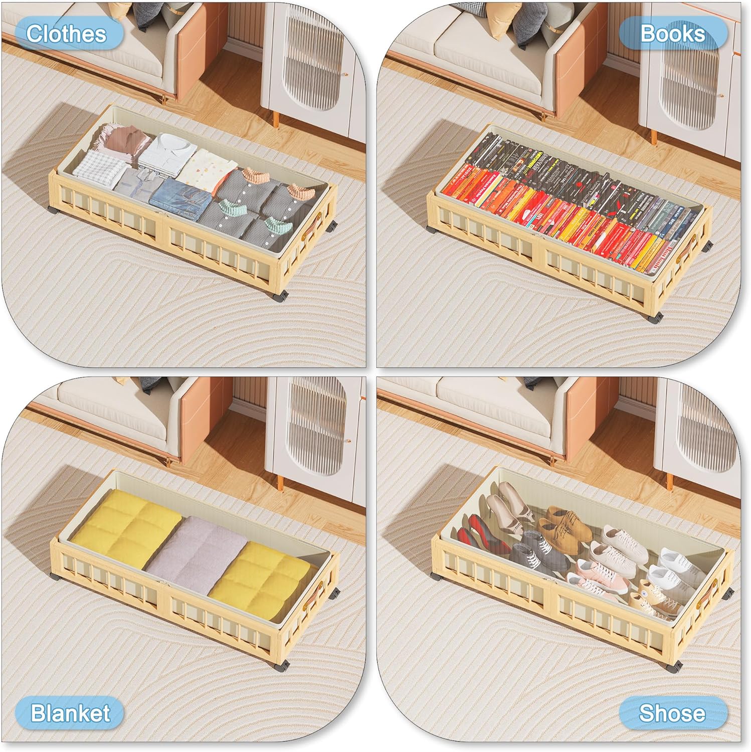 - 【Stylish Look】 Natural Bamboo material make the rolling under bed storage look simple and elegant. 2 PACK Under bed Storage are great for bedroom, living room, dorm and basement. Choose it to make your tiny space a new look!