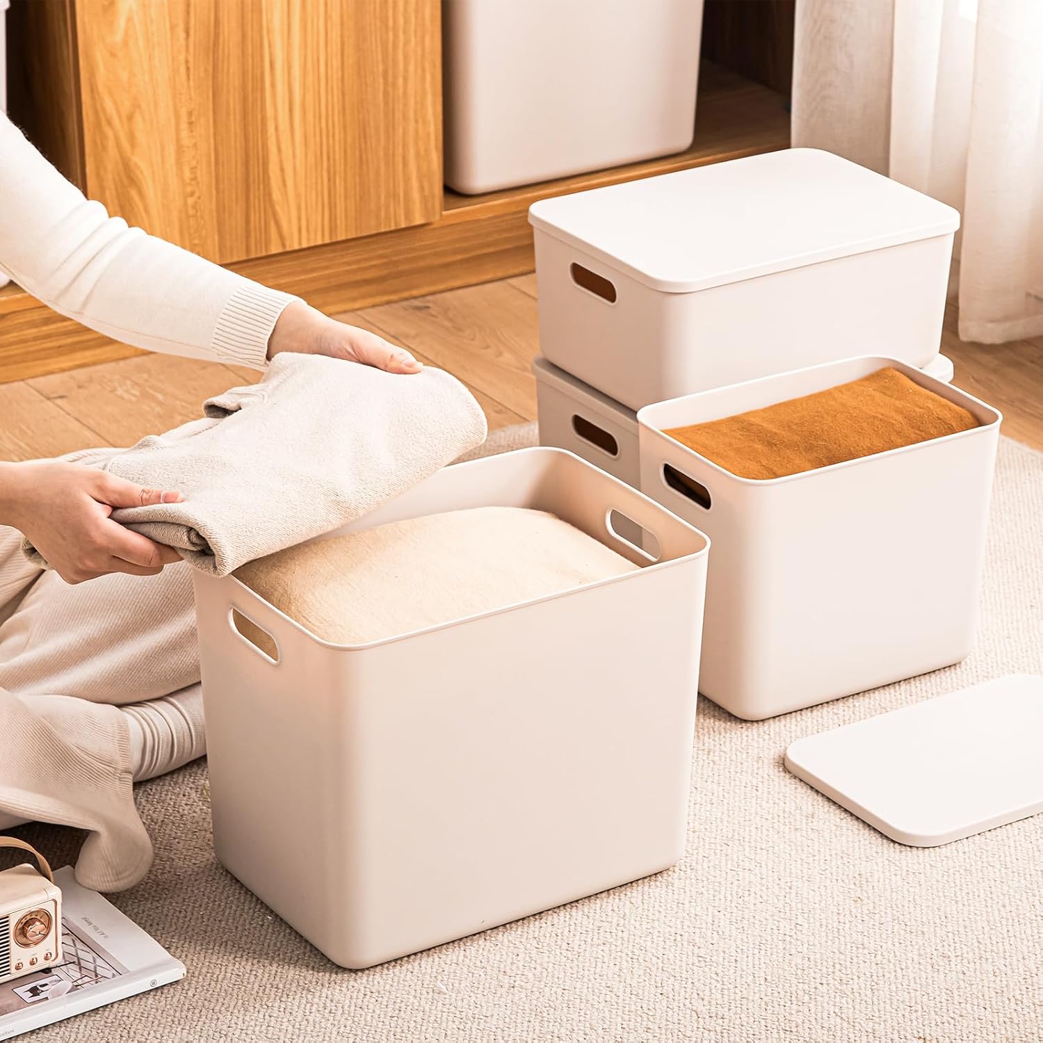 - 【STACKABLE & NESTABLE】 Lidded organizing baskets can be stacked when you use, save space and keep things tidy, it can be nested within each other when you not use them, save your space.