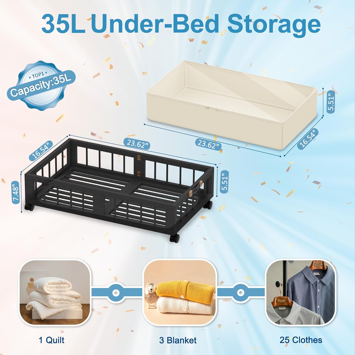 efluky 2-Pack Bamboo Under Bed Storage Containers with Wheels, Under Bed Clothes Storage Basket with Large Dust Bag, Rolling UnderBed Storage for Bedroom, Dorm and Basement, Black