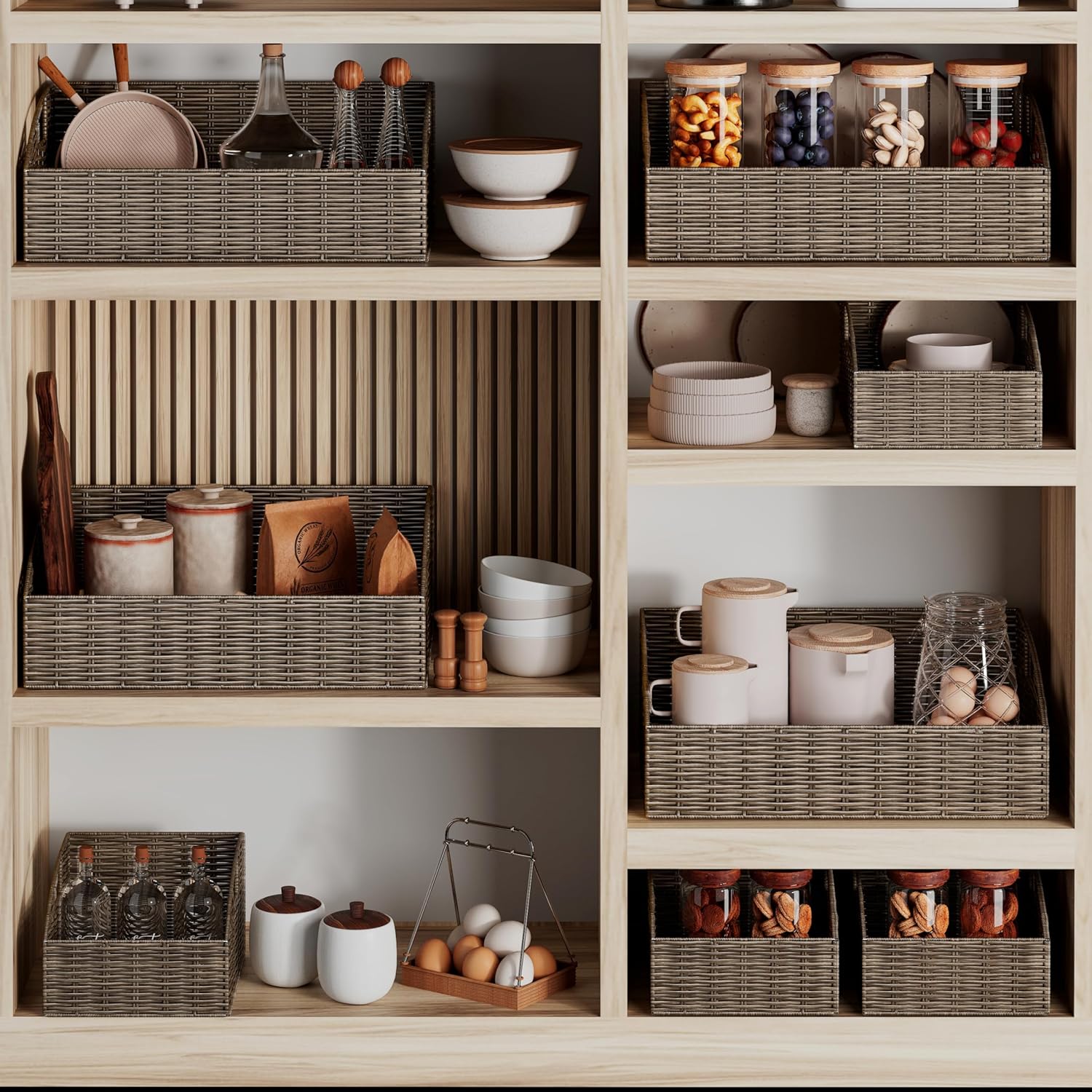 - STURDY AND DURABLE: The durable wicker storage bins are hand-woven by seasoned artisans over a rugged iron frame. The wicker storage baskets can be used for a long time without deformation. Simple and easy to clean the pantry baskets, all you need to do is wipe it with a damp cloth.