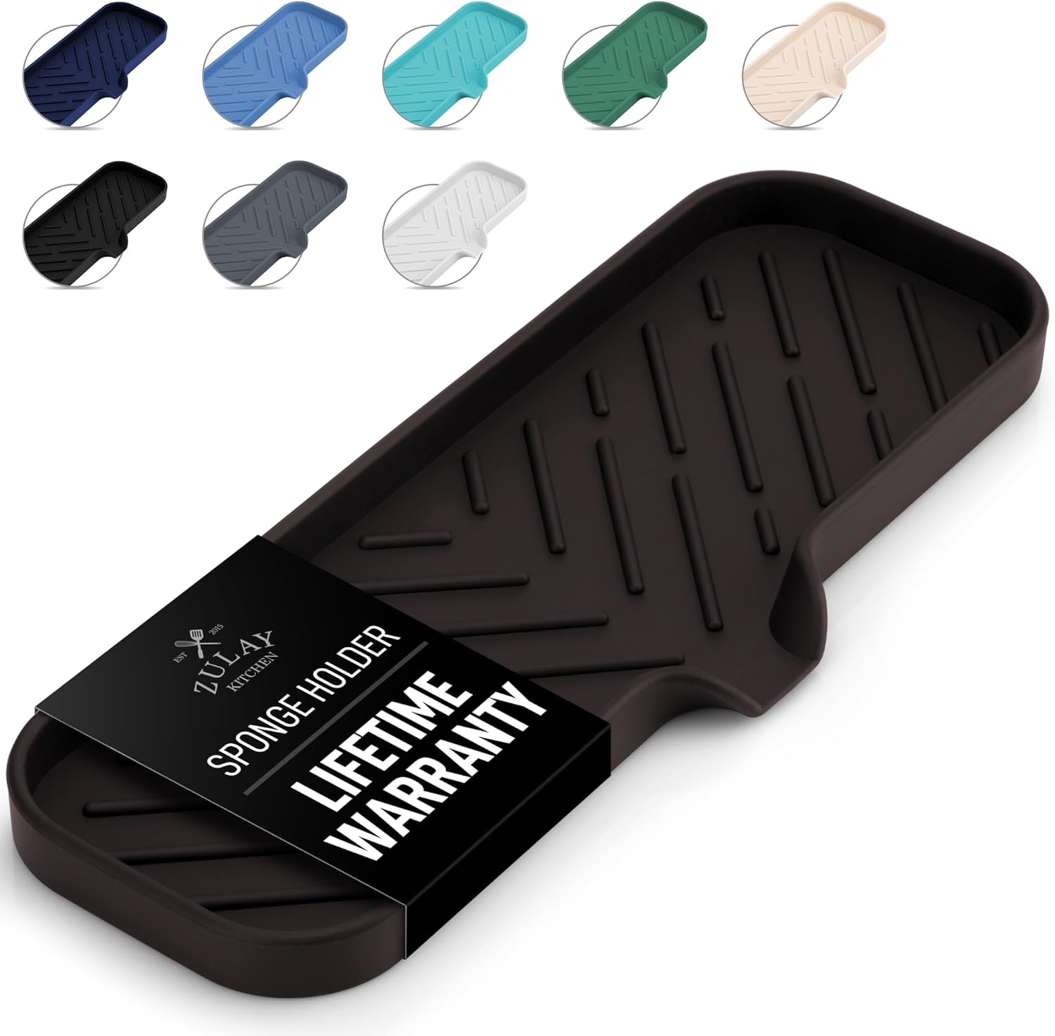 Zulay Large Silicone Sponge Holder (12x4) – Flexible Sink Organizer Tray for Kitchen & Bathroom – Multipurpose Soap Dish for Sponges, Makeup, Trinkets & More (Chocolate)