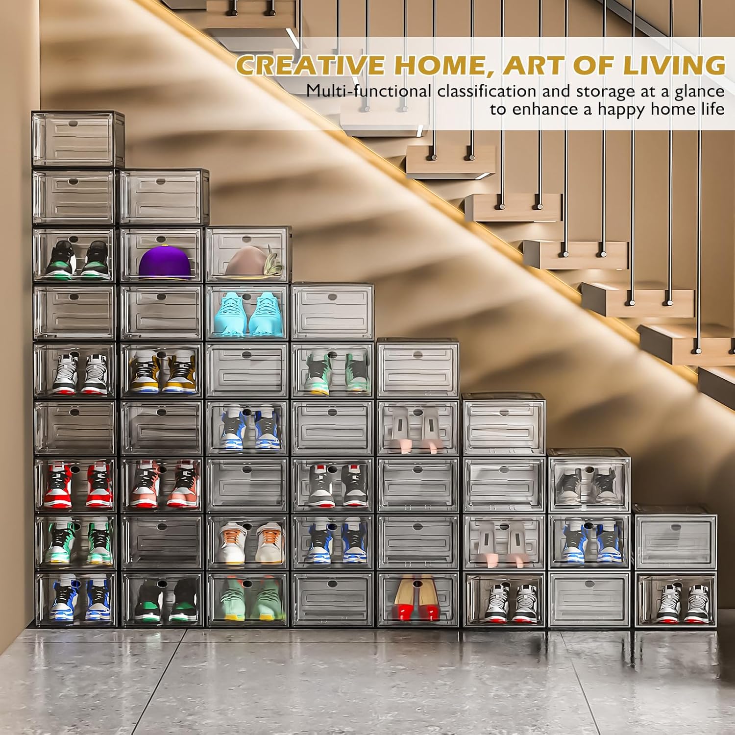 - 【Clear & Stackable Design】Easy to Use & Space-Saving Featuring a transparent magnetic front door and stackable design, these shoe boxes allow you to easily see and access your shoes. The interlocking pegs ensure safe and stable stacking, creating multiple layers of organized shoe storage