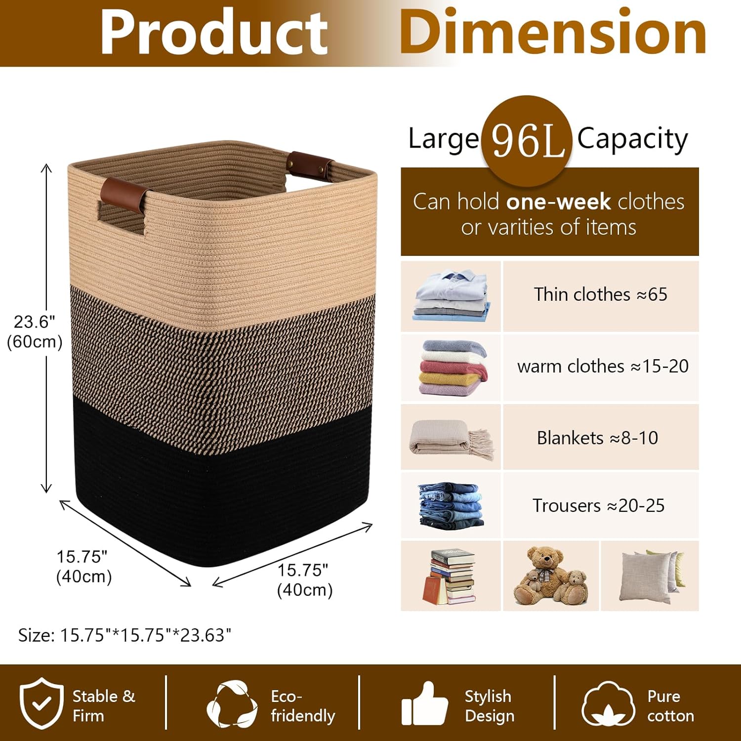 - Oversized Laundry Hamper: 15.7"*15"*23.6"extra large laundry basket. Super large capacity of 96 L, which can meet the clothing storage needs of a family for a week. Large basket can also store bulky items like blankets, comforters, duvets, throw pillows