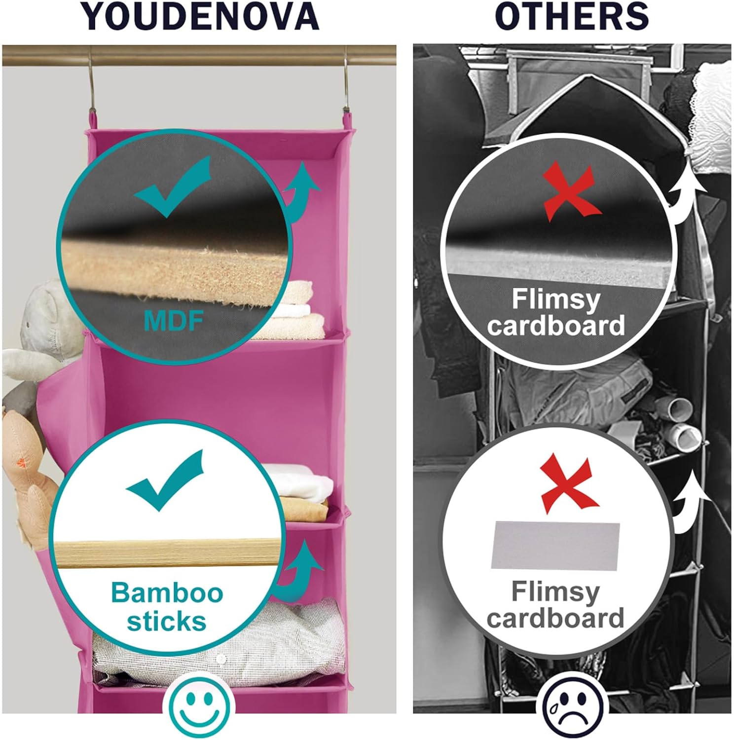 - High Quality: Our hanging closet organizer is crafted from sturdy and thick non-woven fabric, ensuring long-lasting use. Unlike similar products, it features 2 sturdy bamboo sticks at each shelf and MDF board at the top and bottom, effectively preventing the compartments from bending
