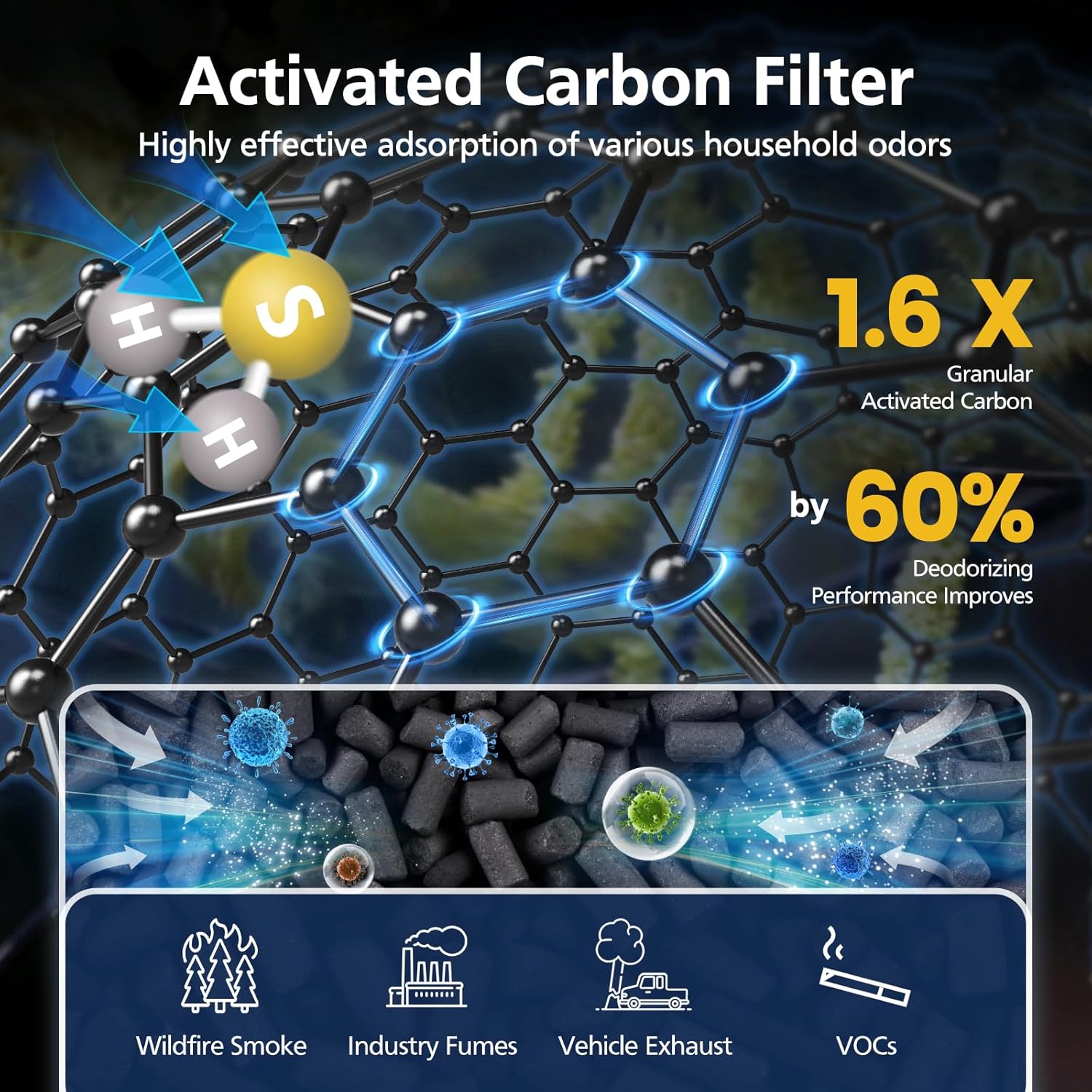 - 【Intense Smoke Customized Filter】This customized 200M filter for homes is dedicated to bringing fresh air into your home environment. It effectively filters out wildfire smoke, industry fumes, vehicle exhaust and other harmful gases. All-round protection for you and your family's breathing.