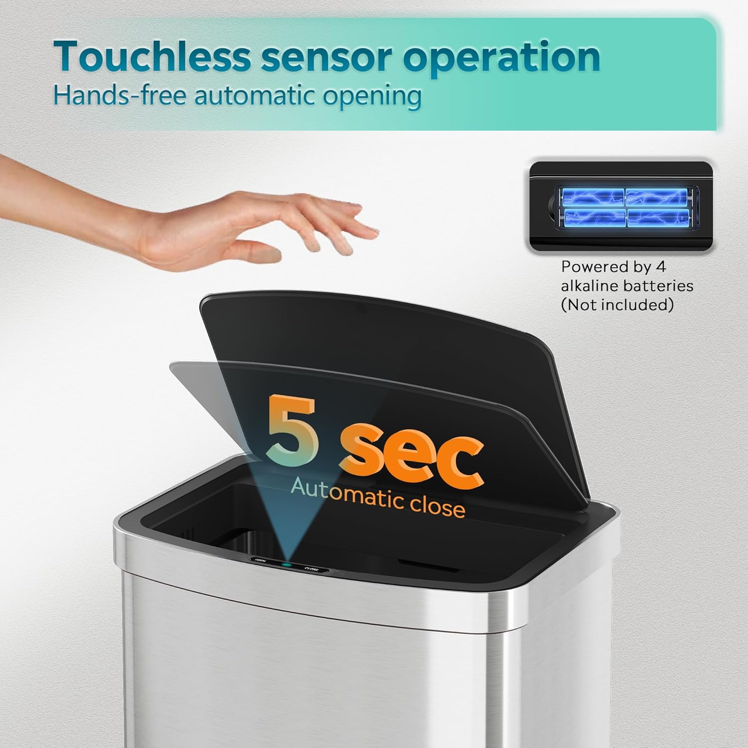 - Hands-Free Motion Sensor: The garbage can features a smart sensor that automatically opens the lid when your hand is within 20 cm. It responds in just 0.3 seconds and closes automatically 5 seconds after you move away.