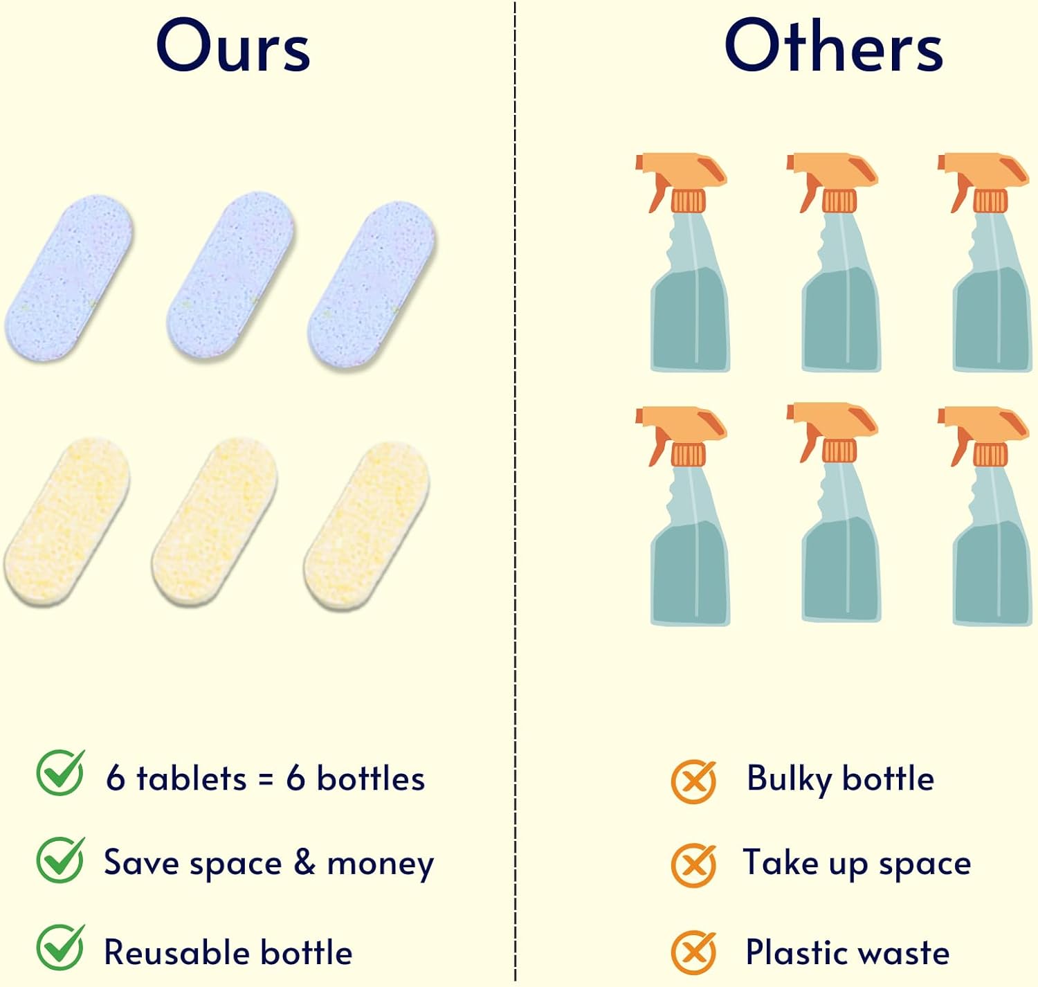 - WHAT YOU GET: 1 pack glass spray bottles and 6 Pack Multi-purpose cleaner tablets, can create 6 bottle of 16.9 oz cleaner and save plastic bottles from going into the landfill,thus you get a great all around sustainable cleaner. We do our best to our world as our companies mission and willingness.