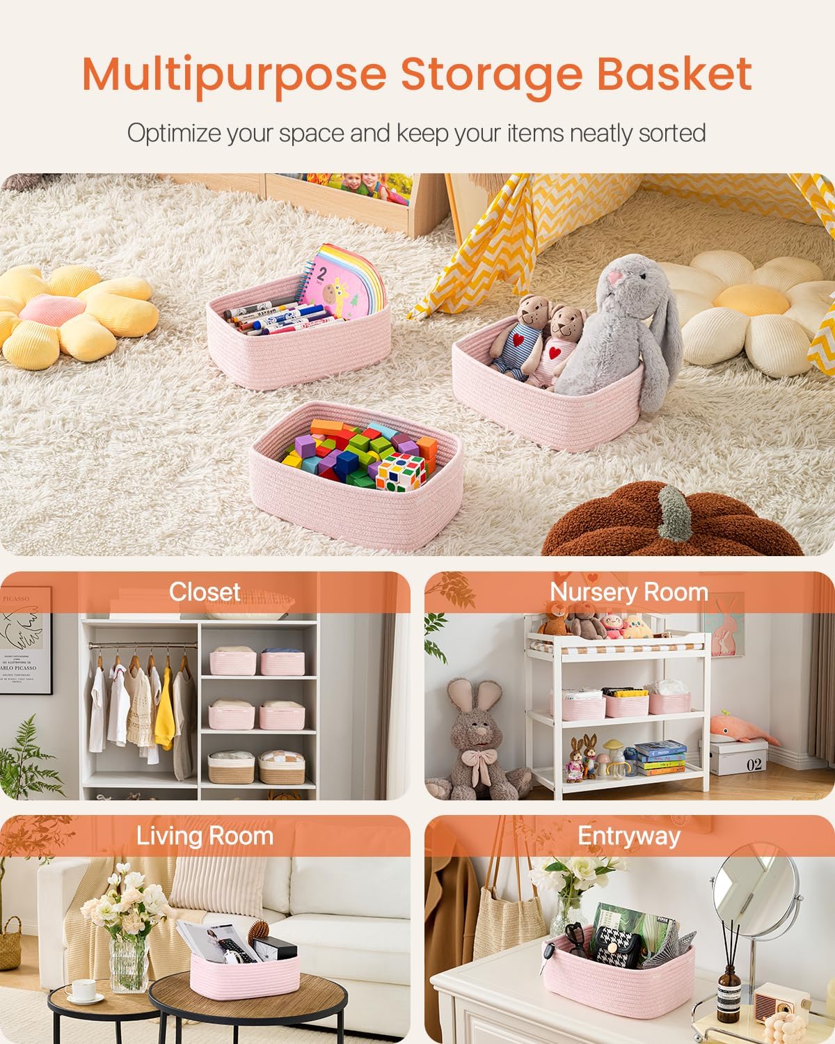 - [ Elegantly Designed to Match Any Décor ] Our small rope basket creates a minimalist appearance, and it adds a touch of warmth and texture to any room. The classic solid color design ensures seamless integration with your existing aesthetics, complementing any decoration. Perfect as decorative storage baskets for shelves, cabinets, and any open display space, making them a stylish and practical addition to any decor, enhancing the overall aesthetics of your room