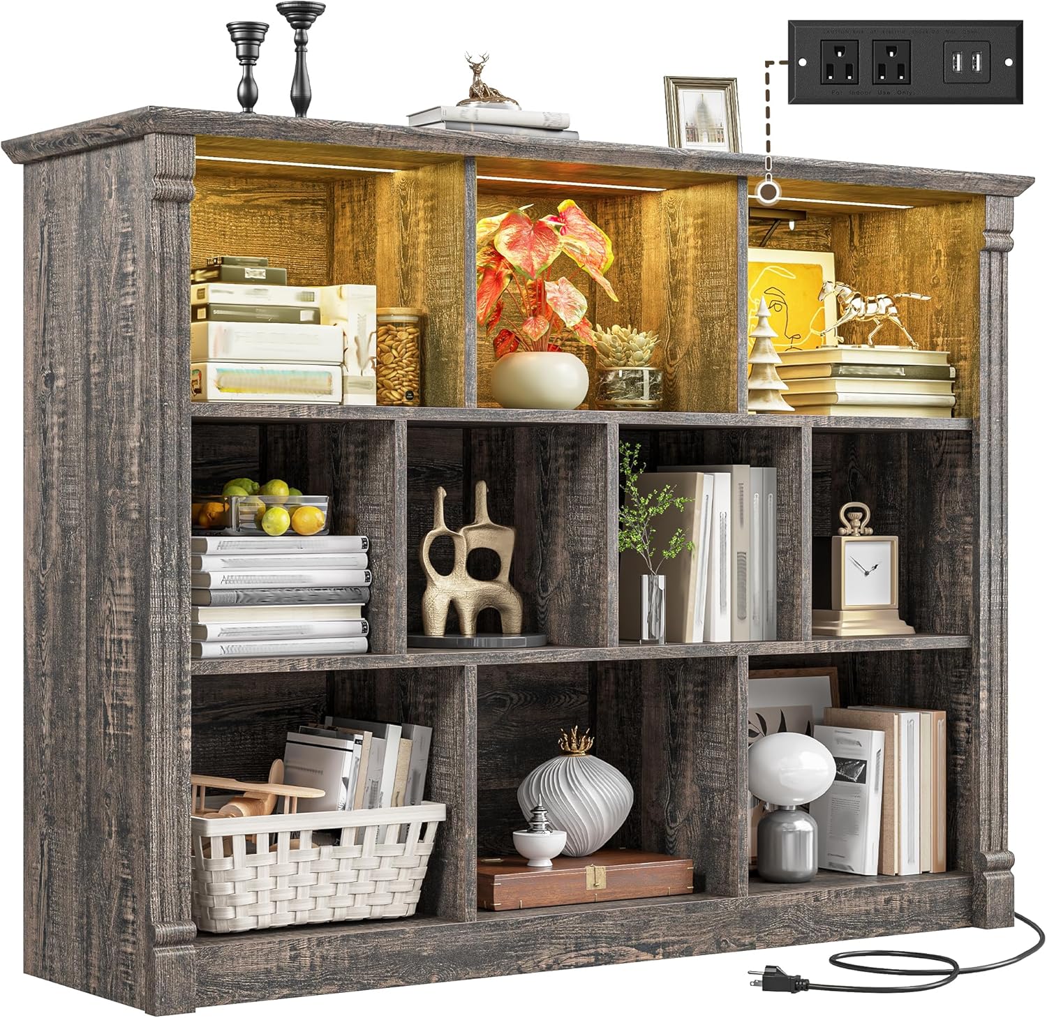 EnHomee 10 Cube Storage Organizer with LED Light and Charging Station Wood Cube Shelf Display Cabinet for Bedroom Living Room,Office,Black Oak