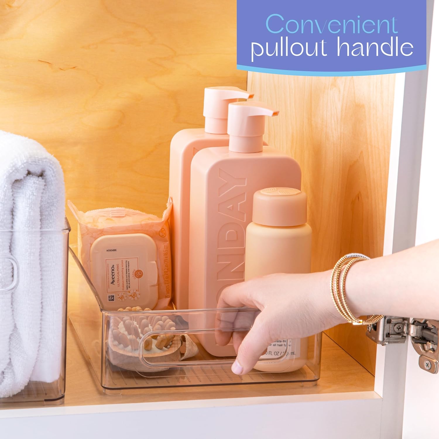 Plastic Food Storage 4 Pack Clear Container Bin with Handles for Organizing Kitchen, Pantry, Refrigerator, Freezer, Pantry, Cabinet, Closet, Bathroom. Stackable 10”x8”x3”