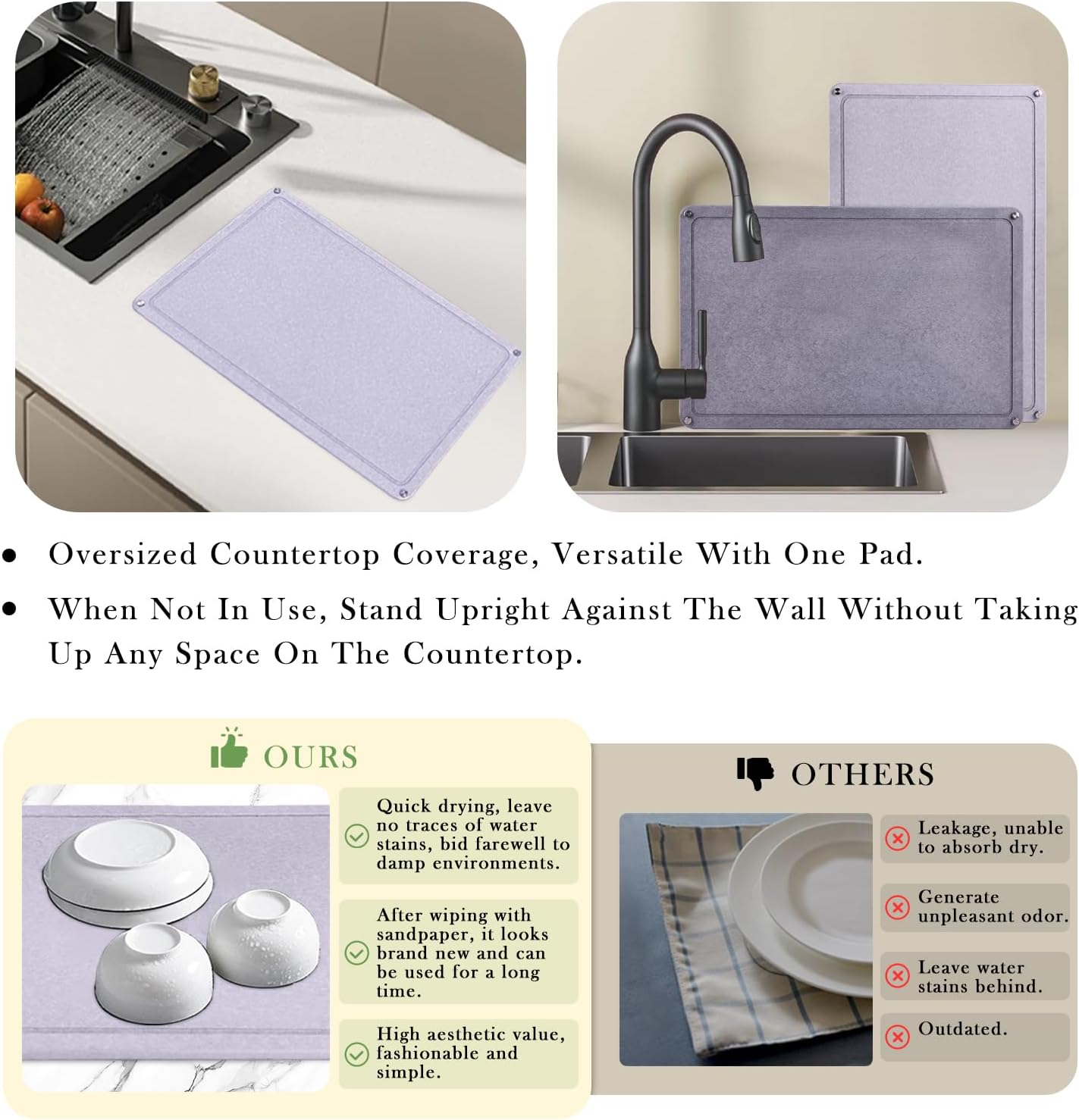 - 【 Versatile Use & Modern Design 】Not just a quick dish drying stone mat for kitchen sink, it also doubles as a heat-proof mat, or pet feeding mat. Its sleek, natural design makes it a practical and thoughtful gift for friends or family who value a clean, organized kitchen.Tips:Avoid spilling dark liquids like coffee or red wine to prevent staining