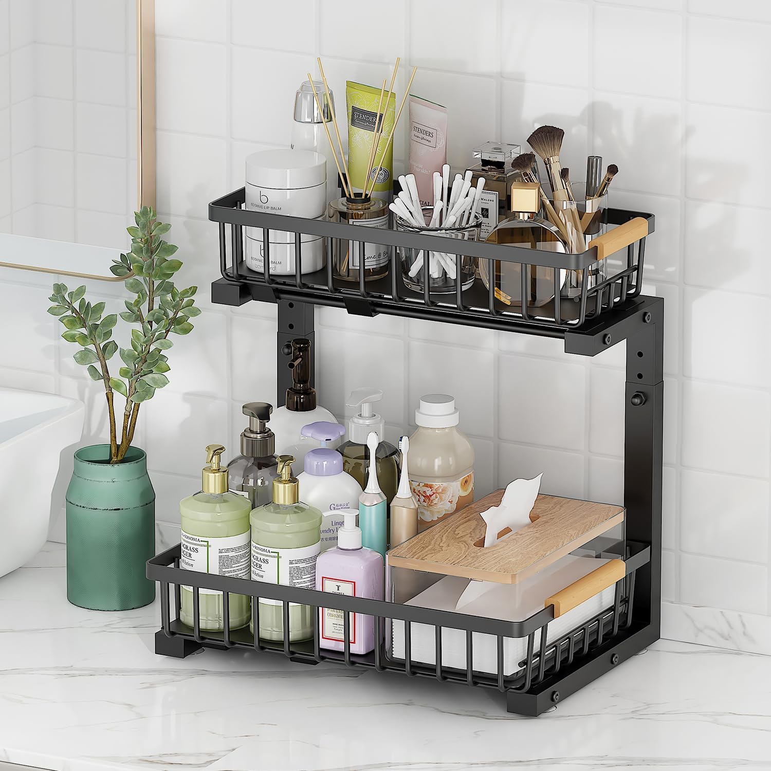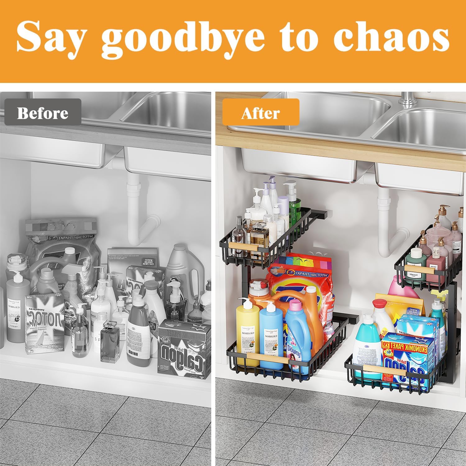 - 2-Tier Pull-Out Storage Baskets: The 2-tier under-sink organizer features smooth sliding rails, ensuring both upper and lower baskets slide out effortlessly without jamming or making noise. The dual-slide functionality makes accessing deep cabinet items easy, especially in deep cabinets.