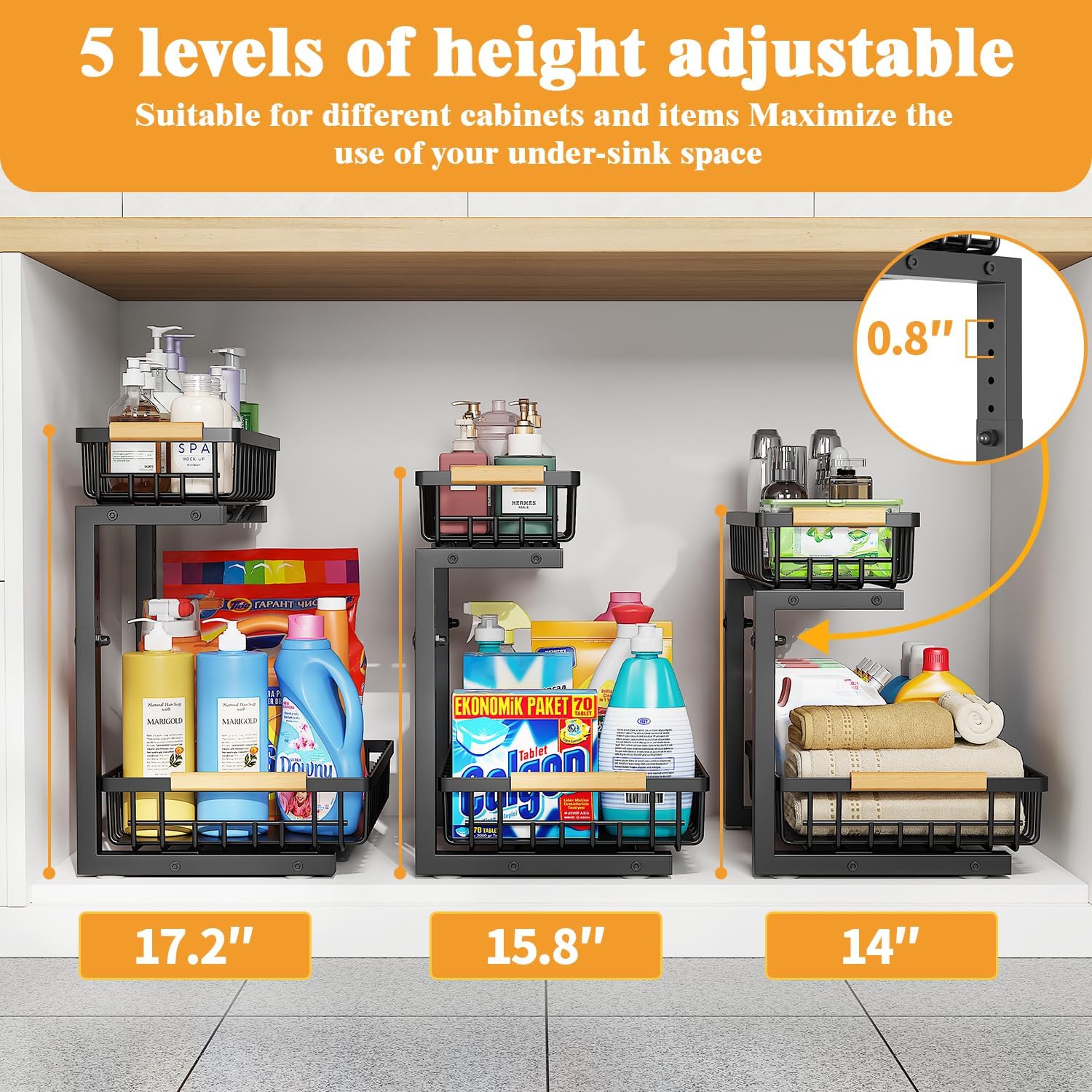 - Adjustable Height for Versatility: This organizer offers 5 adjustable height levels with 0.8-inch spacing, making it suitable for cabinets and items of various heights. The overall height can be adjusted from 14” to 17.3”, allowing for easy customization according to your needs