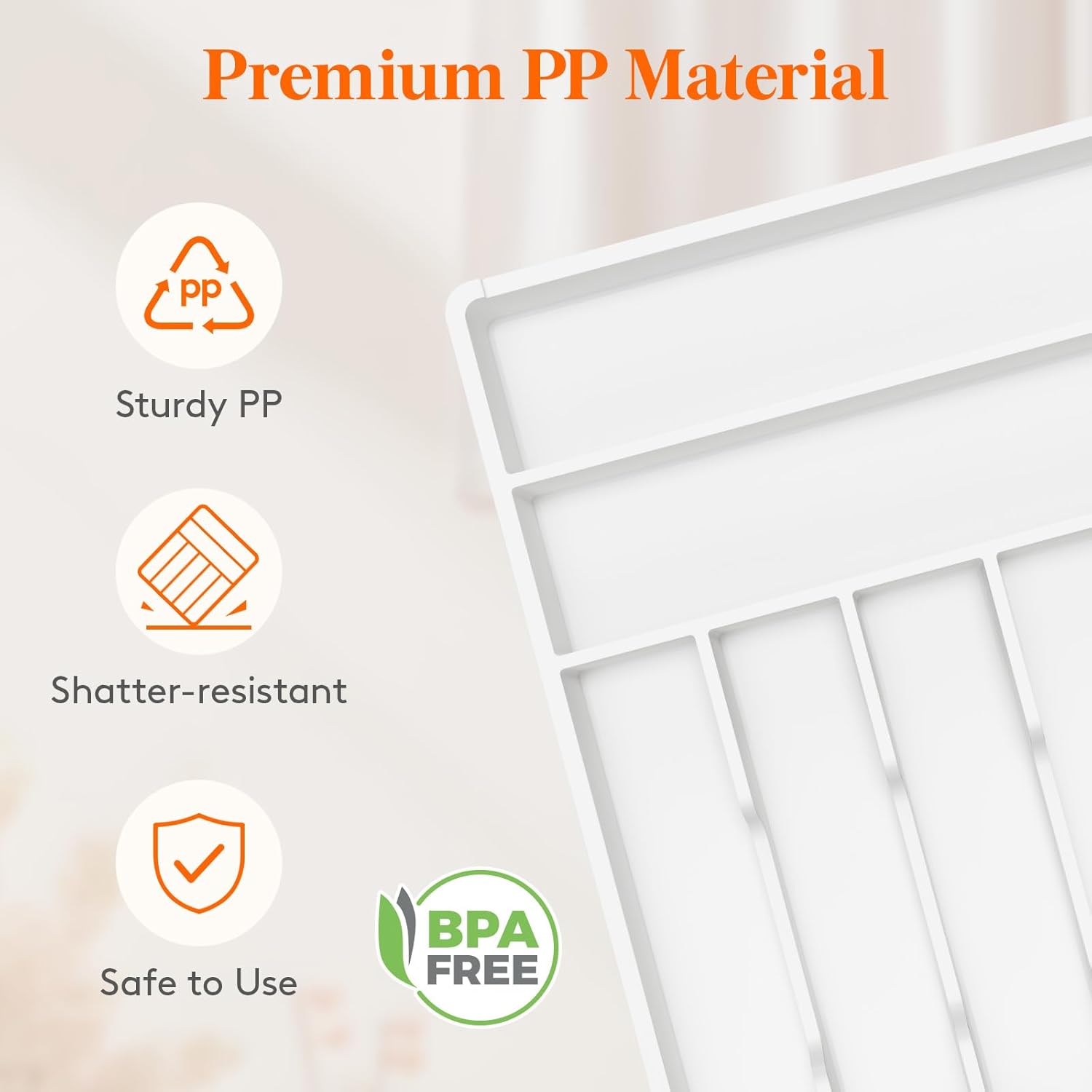 - Robust and Safe: This kitchen drawer organizer is crafted from premium PP material, BPA-free and built to last. It ensures your silverware is stored in a healthy, safe environment for worry-free use