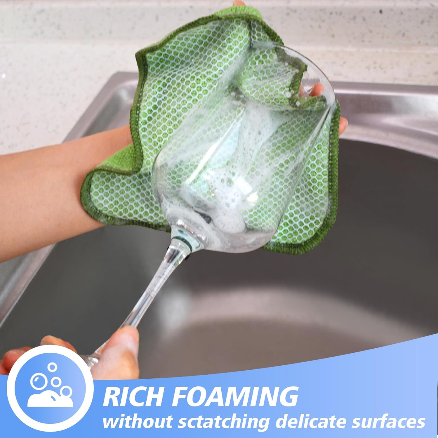- DISH RAGS FOR KITCHEN CLEANING WITH POLY SCOUR SCRUBBING SIDE: One side is microfiber and the other side is mesh. The microfiber side works well at getting finger spots off the stainless steel appliances and the glass front of fridge or stove, microwave; the scrubby side is good for cleaning stuck on food without having to grab your scraper and does not scratch delicate surfaces either