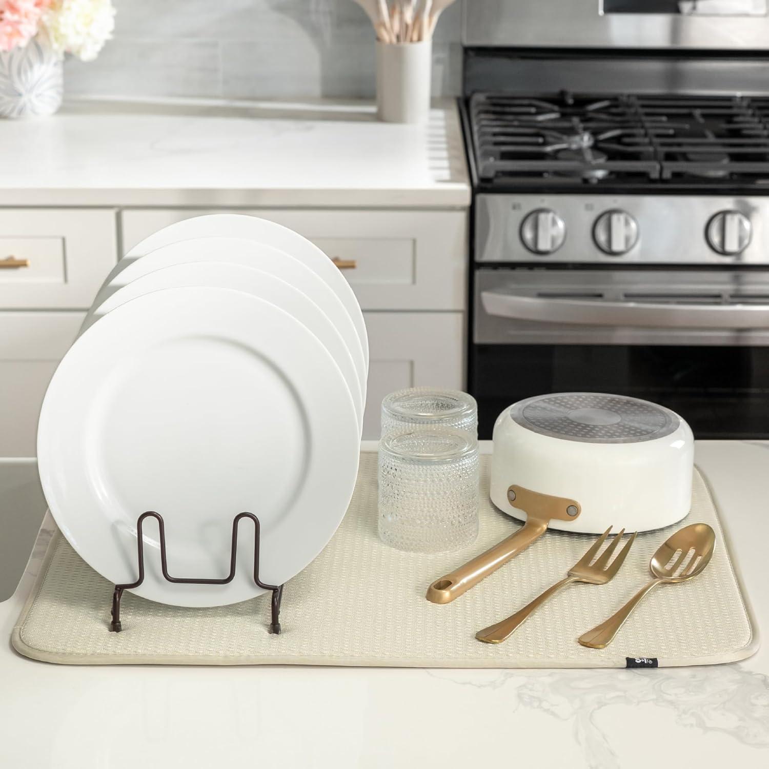 - Dish drying mats for kitchen counter are reusable, machine washable, and easy to store for kitchen organization; durable construction will not chip or break like a stone dish drying mat for kitchen