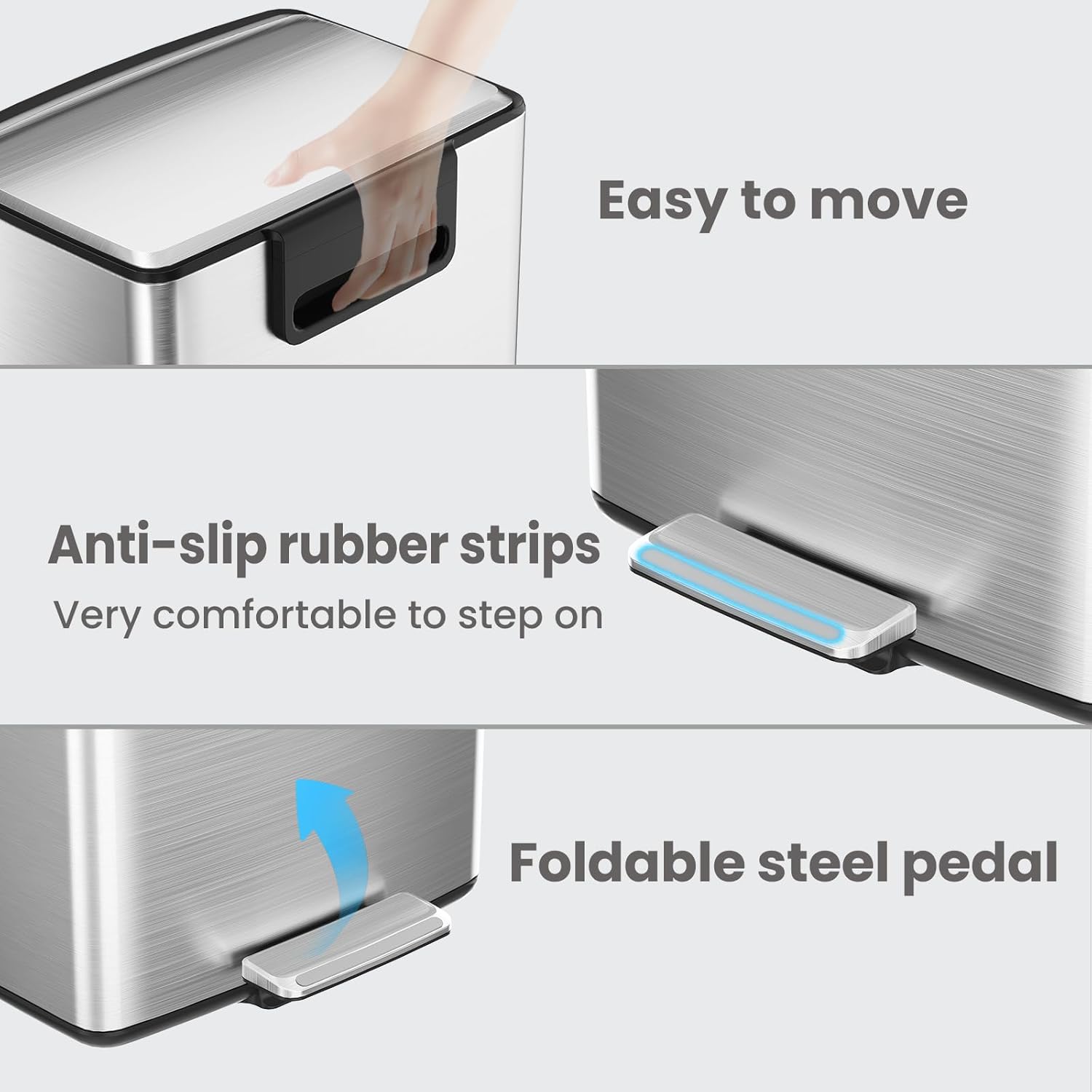 - Dwsign benefits: Garbage can with lid stays open, removable inner bucket, collapsable foot pedal and carrying handle, etc.
