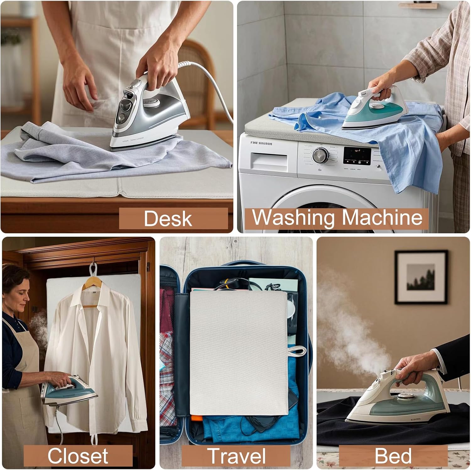 - 5-layer Design Thickness Ironing Mat: Breaking away from traditional products on the market, you will get an exceptional ironing experience. Compared to other brands such as wool and soft fabric materials, our five layer thickness (Made of high quality cotton, heat resistant spong and board) ensures better heat resistance, longer lifespan, and desktop protection. Strong stable and anti-slip, even when used on soft surfaces such as beds.