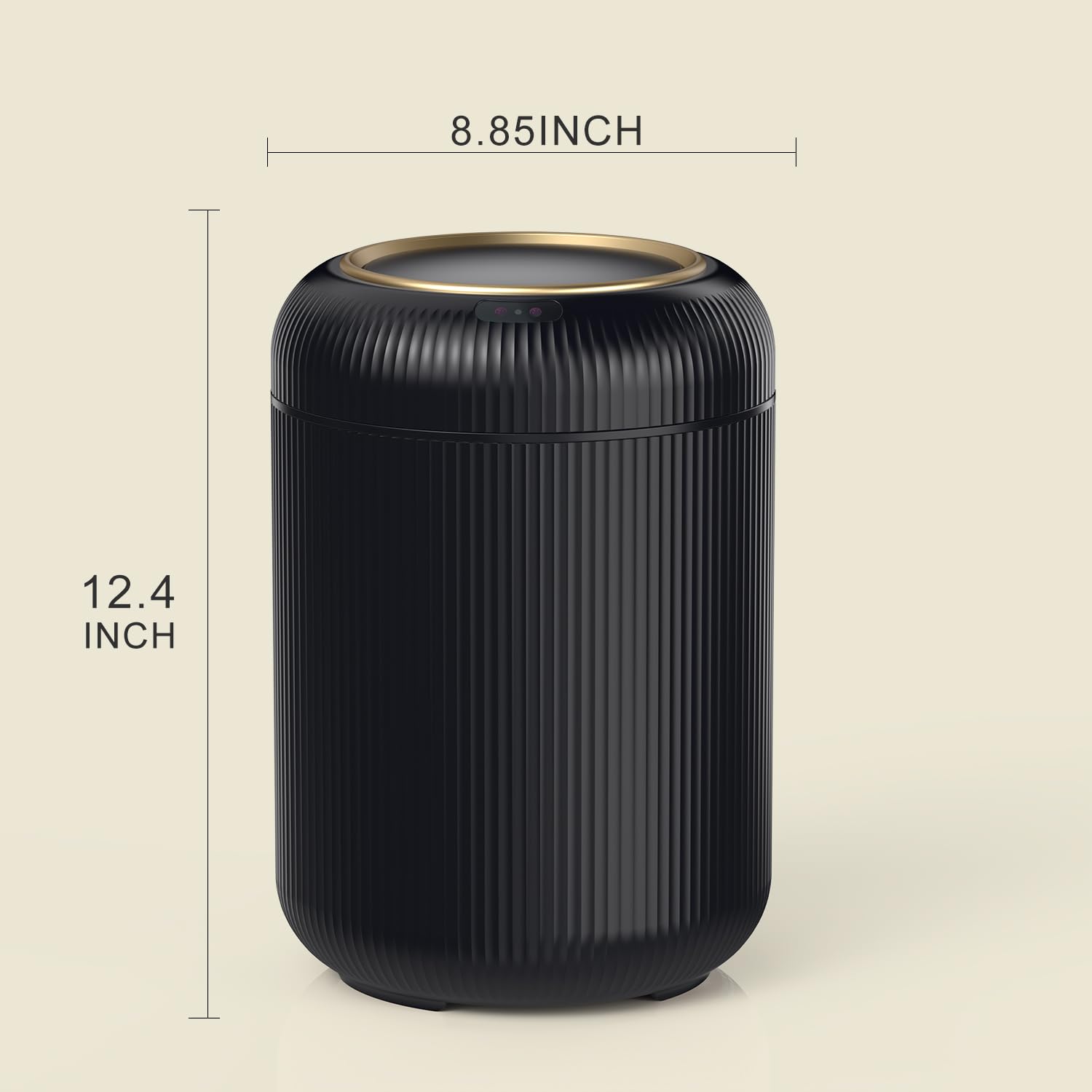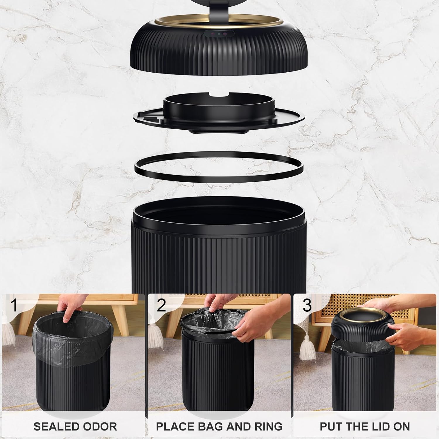 - 【Odor Control & Silent Operation】The no touch diaper pail effectively seals in odors, ensuring a fresh home environment. Its soft lid design minimizes noise, delivering a quiet experience during use.The inside of the black and gold trash can comes with a black pressure ring. Take it out and put a garbage bag over it, you can hide the unpleasant bag inside.