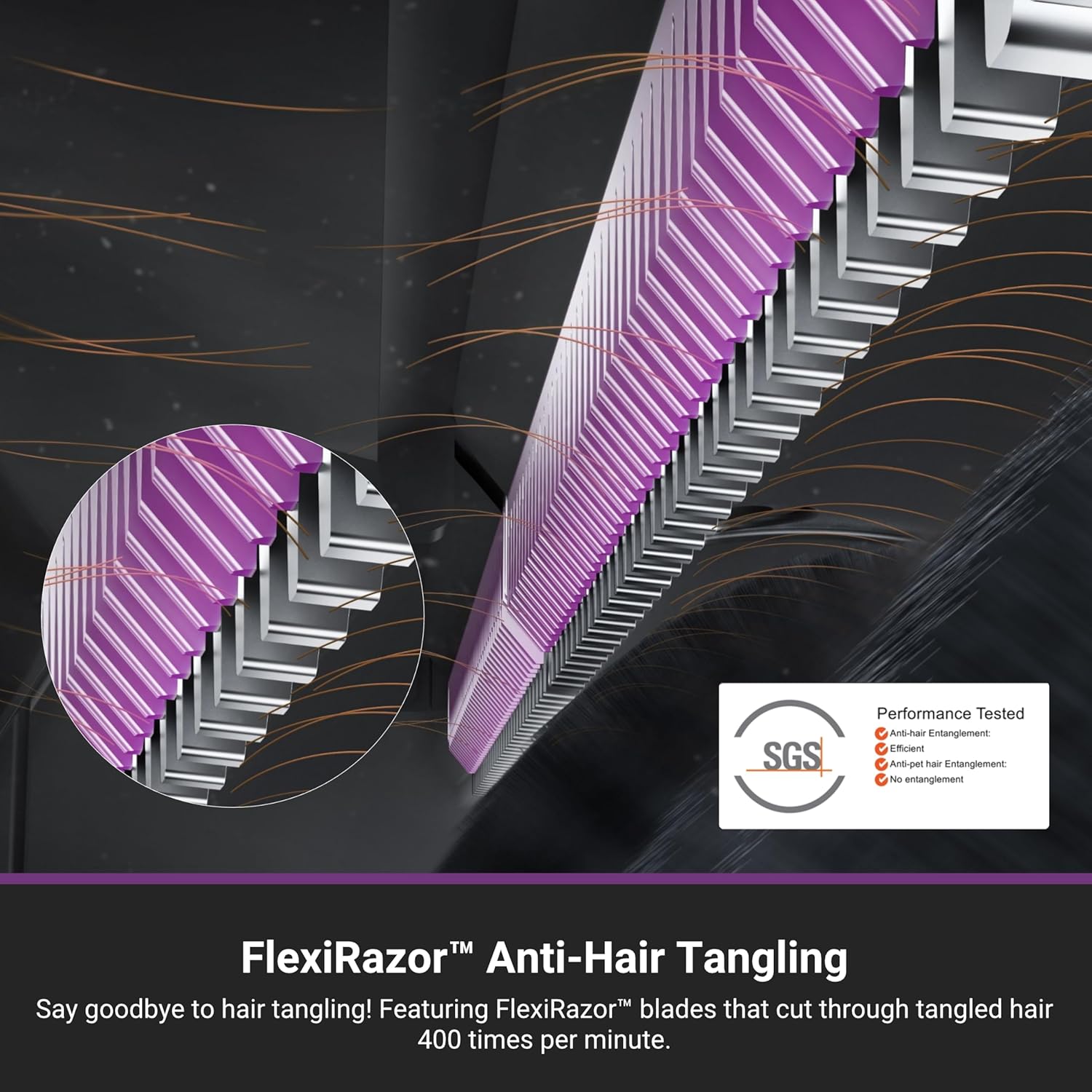 - Anti-Tangle FlexiRazor Brush: Cuts hair 400 times per minute to prevent tangles, reducing brush maintenance and keeping suction strong—ideal for pet owners.