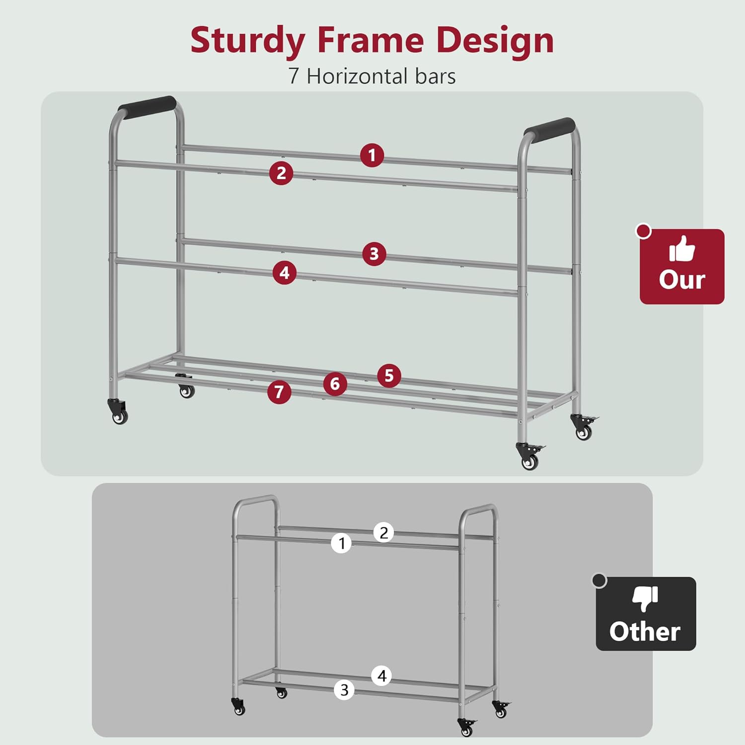 - Sturdy and Durable: Made of high-quality metal, it has good load-bearing performance. 7 metal horizontal bars make the laundry cart with wheels frame more stable, and the horizontal bars at the bottom of the 5 laundry hamper sorter prevent the bags from sagging when loading clothes.