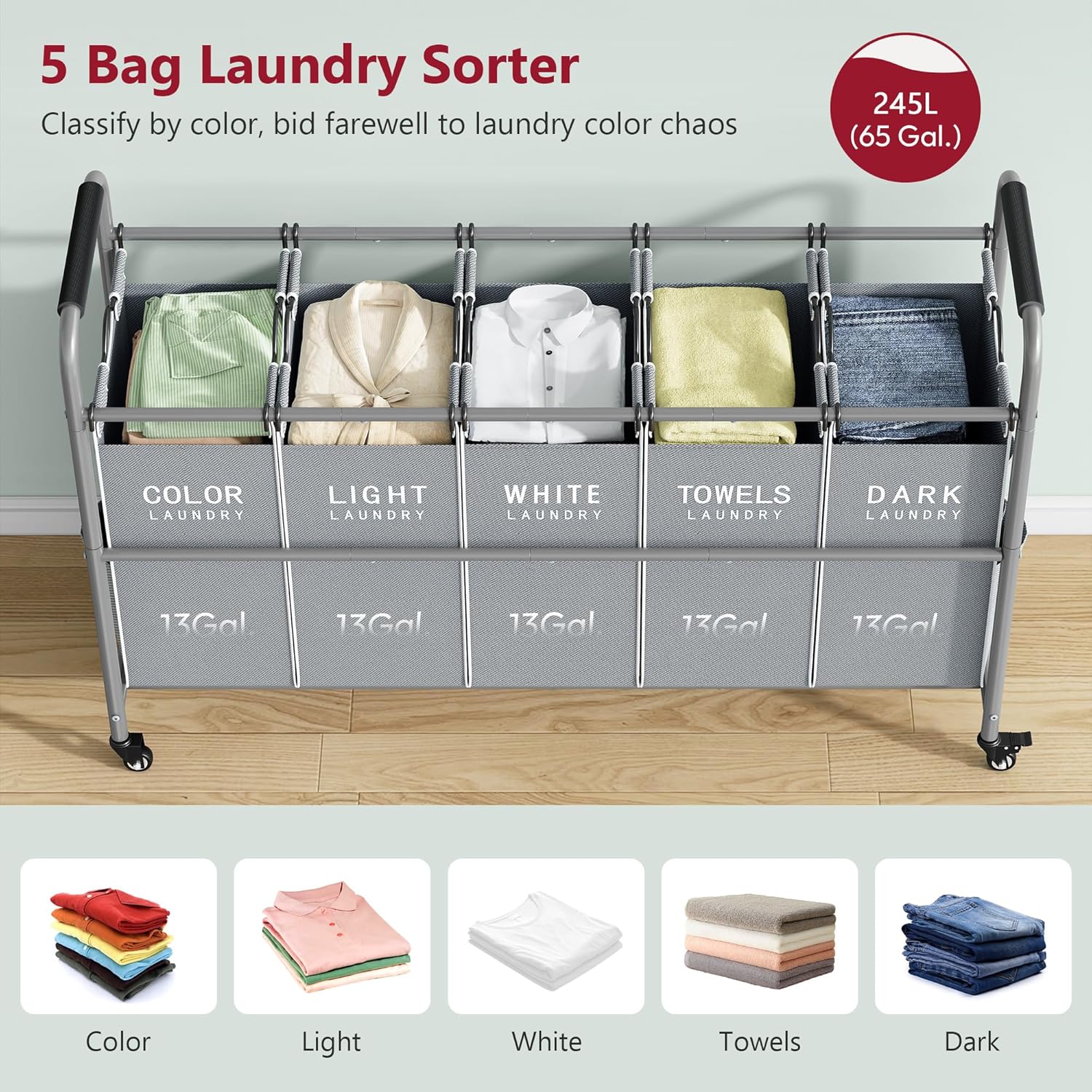 - Efficient Sorting Helper: The rolling laundry sorter comes with 5 separate laundry bags, and the clothes separation bags of different colors allow you to easily sort dark and light clothes. Simply use the two metal handles to remove the laundry bags individually from the laundry sorter.