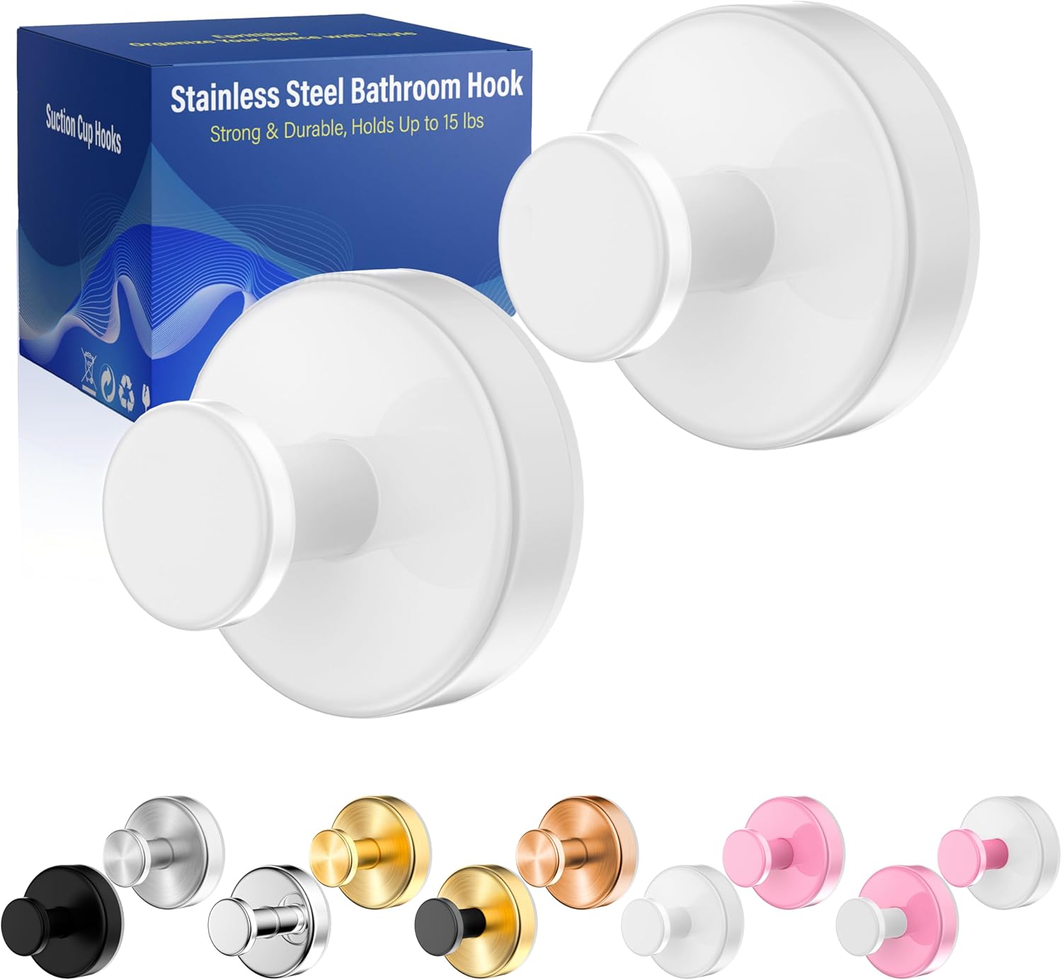 Suction Cup Hooks for Shower,Removable No Drill Towel Hooks,Upgraded 15 lbs Strong Suction hooks for Bathroom Tile,Shower Wall,Glass Door,Kitchen-Loofah,Coat,Stainless Waterproof-White 2 Pcs
