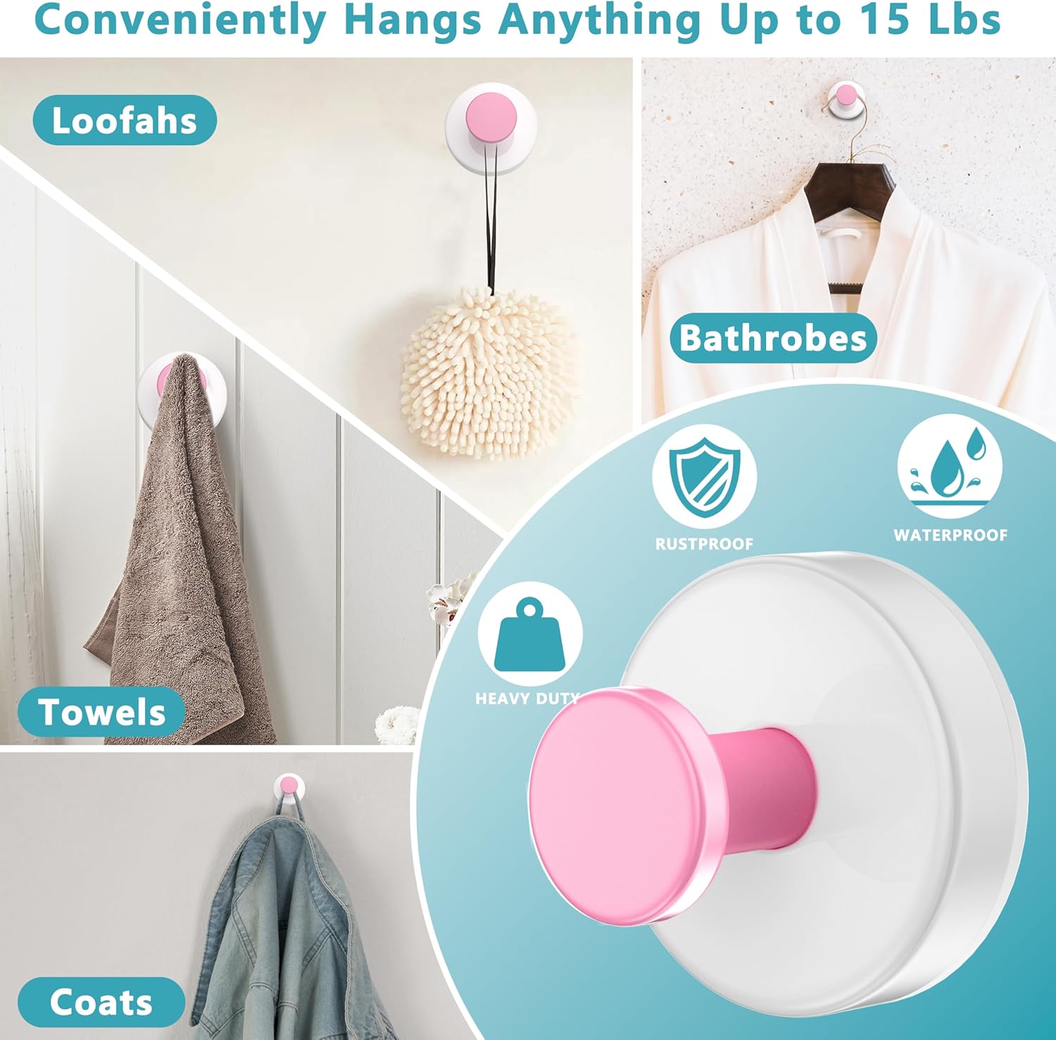 - 【Hangs Securely on 10+ Materials】The suction cup hooks are suitable for bathrooms,kitchens,windows.it can be fixed to fit tile, glass, mirror, marble, metal,acrylic,plastic,stainless steel,quartz,laminate and other smooth wall surfaces.it can hang towels, loofahs, bathrobes, coats and other items up to 15 lbs