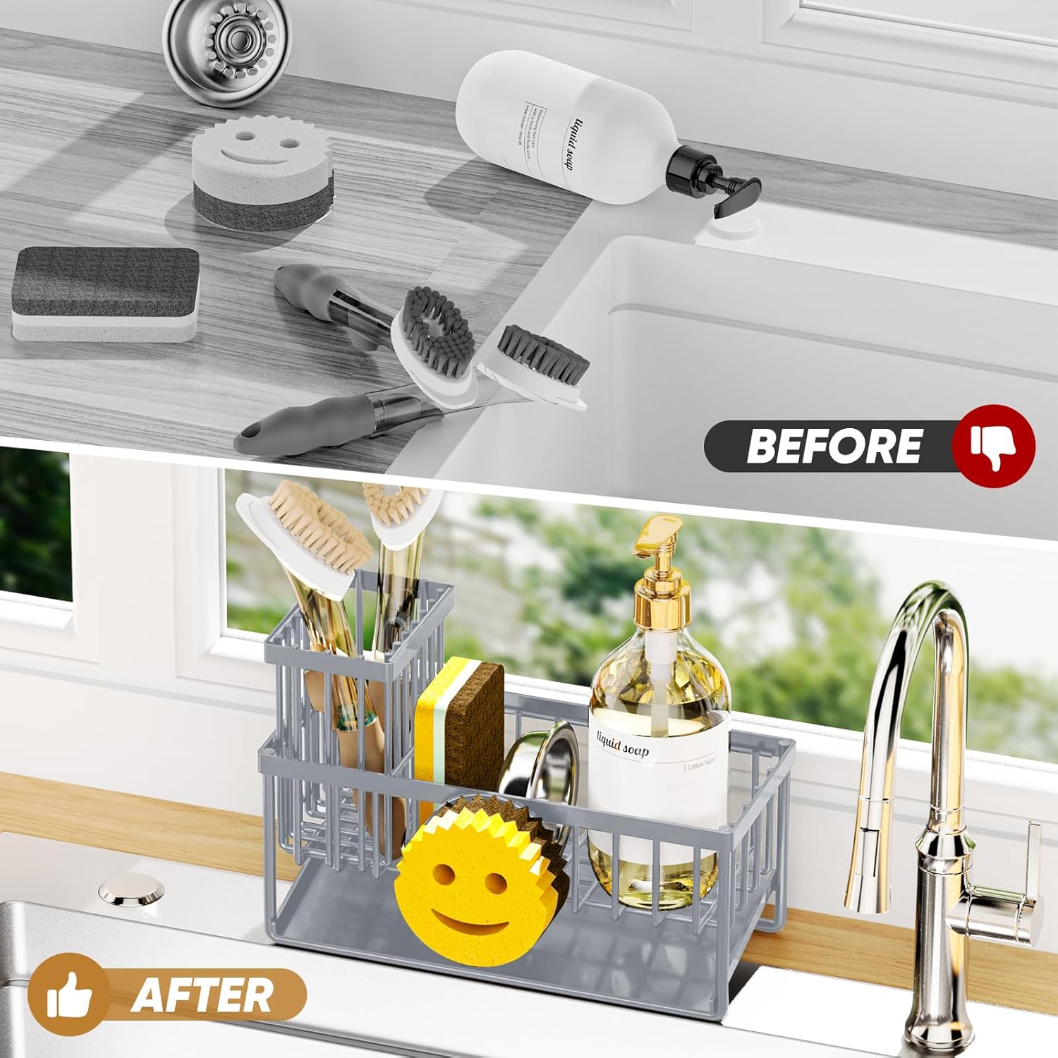 - Large Capacity & Saving Space:The measure of kitchen caddy sink organizer is 9.5"*4"*6.3",which is suitable for kitchens with limited space.It can be used for storing hand sanitizer,sponges,dish brushes,soap,and sink stopper etc.Saving space and keep your kitchen counter far more cleaner and tidy