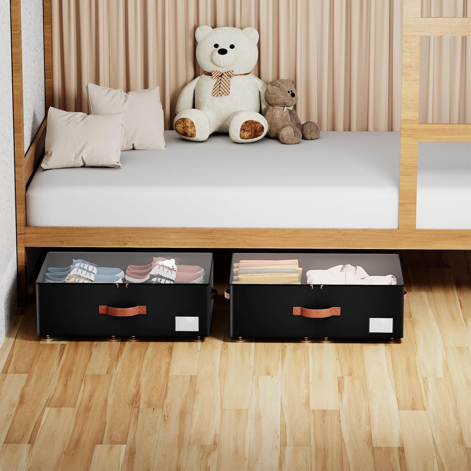 - [No Installation Required]: Say goodbye to complicated setups. Our underbed storage bins can be used directly without the need for installing the bottom and wheels. It's incredibly simple and convenient. Plus, the bottom and upper storage bins can be separated, offering you more versatile usage options. When the upper storage bins are placed in the cabinet, the bottom plate can be used as a shoe rack alone.