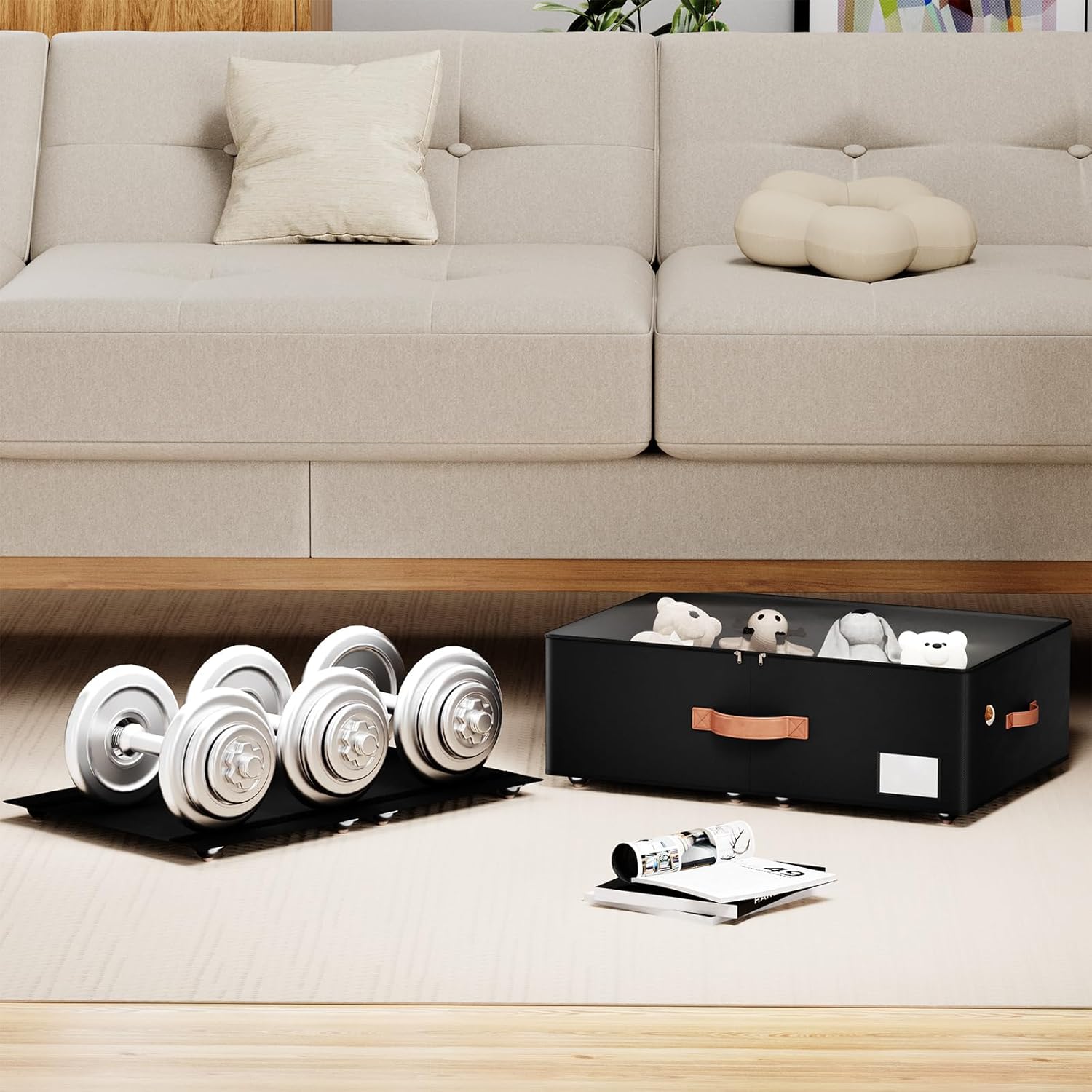 - [Multifunctional Storage Solution]: Our underbed storage box offers versatility for various storage needs. Secured with Velcro, the bottom frame and storage box can be utilized in different places, including closets, cloakrooms, bedrooms, baby rooms, under cribs, and dorms. It's perfect for storing seasonal clothes and everyday items. When not in use, simply fold them up to save space.