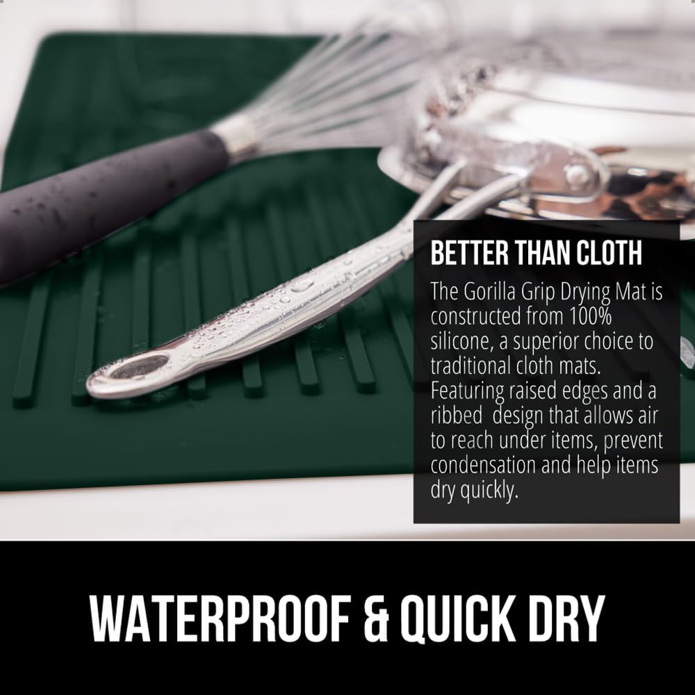 GORILLA GRIP 100% BPA-Free Silicone Dish Drying Mat for Kitchen Counter, 18x24, Quick Dry, Water Catching Ribbed Design, Easy Clean Waterproof Sink Liner, Heat Resistant, Fits Under Rack, Hunter Green