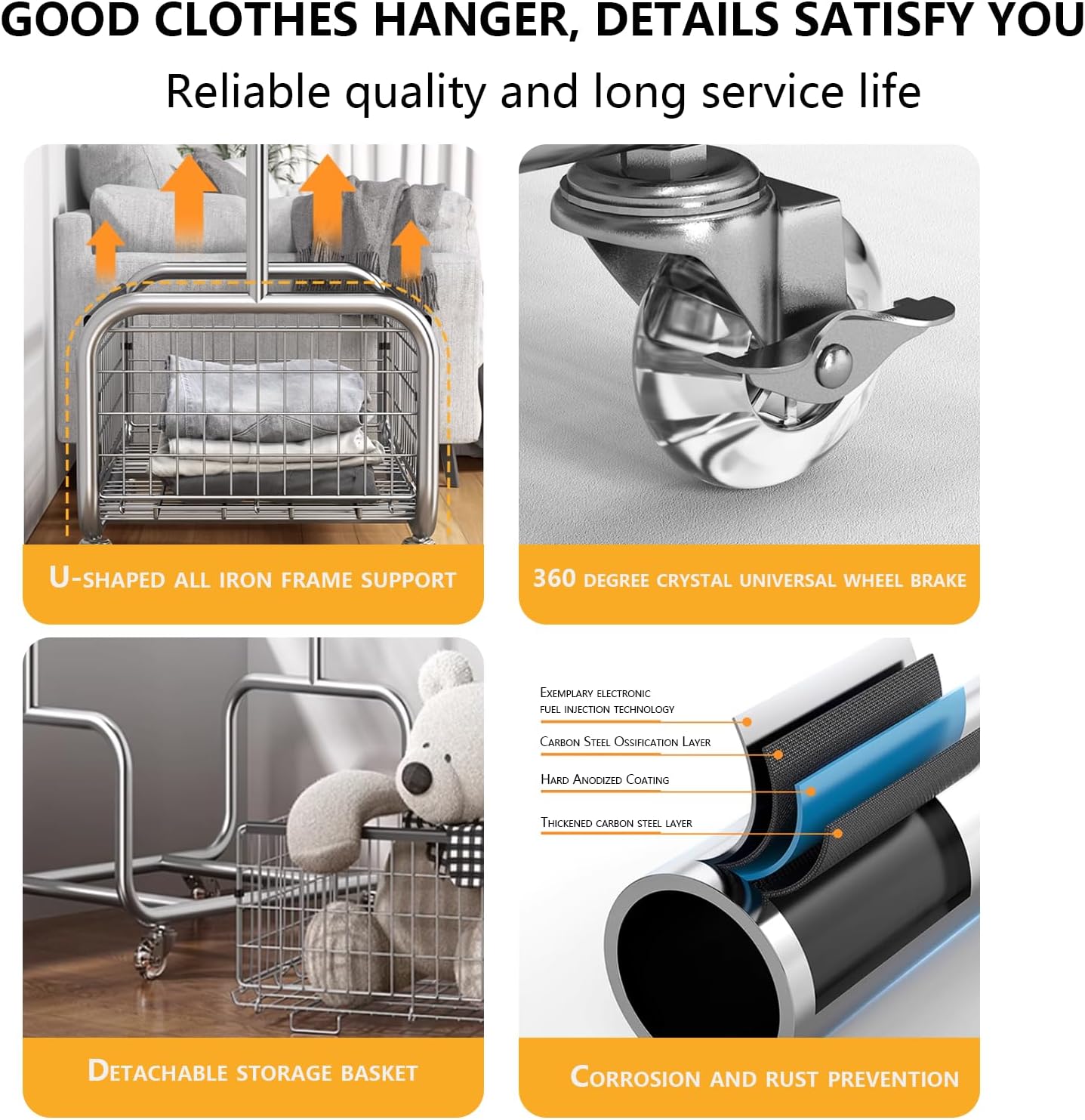 - 【Movable】There are 4 wheels with 360°rotation on the clothes rack, lockable wheels allow a stable stop. At the same time, the wheels will not make noise or scratch the floor when moving.