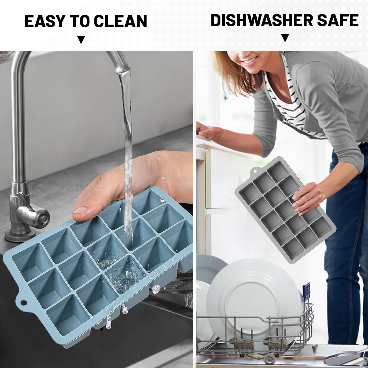 - Easy Release Ice Cube Tray; Soft silicone material and independent cavity design make it easy to release ice, you can push from the bottom to remove ice cubes for whiskey. Square ice cube trays has a non-sticky flexible surface, it is very easy to clean, dishwasher safe