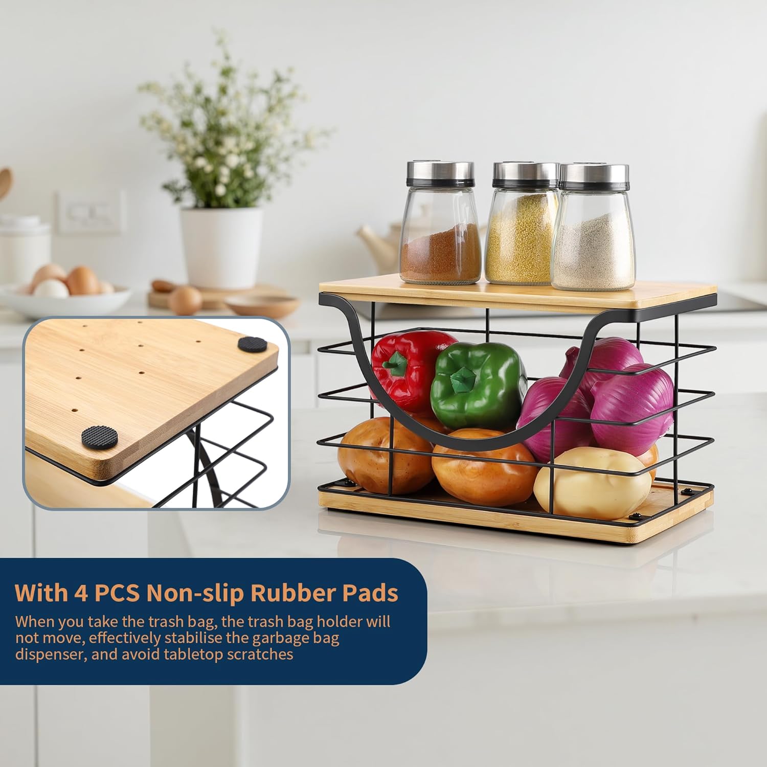 - 2 Ways to Use - kitchen storage organization can be used on a tabletop or self-adhesive wall mounted. No need to drill holes, won't damage the wall. Multi-functional Garbage Bag Storage Dispenser is suitable for kitchen, laundry room, toilet, under the sink, cabinet, etc., you can store laundry supplies, cleaning supplies, vegetables and fruits, snacks and so on