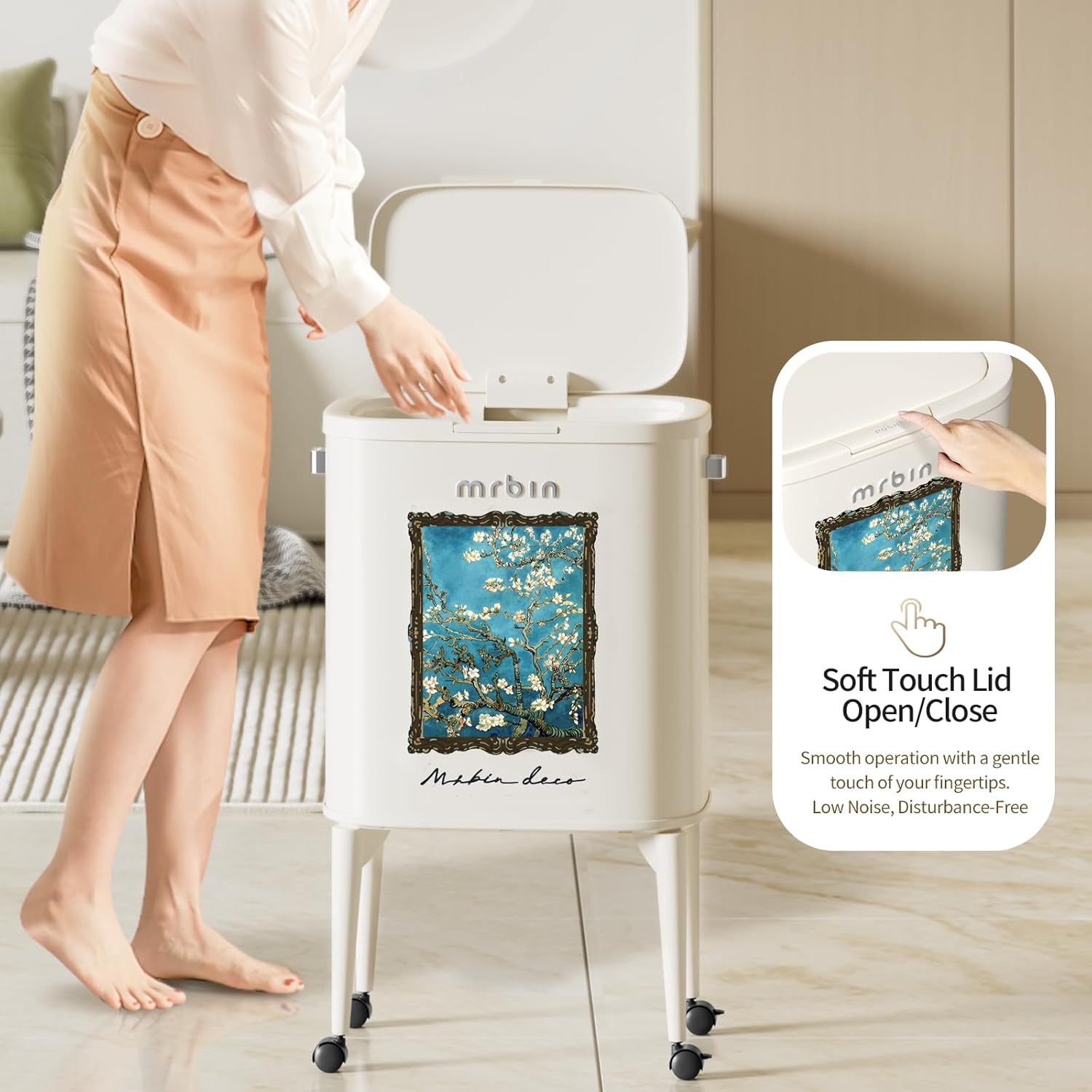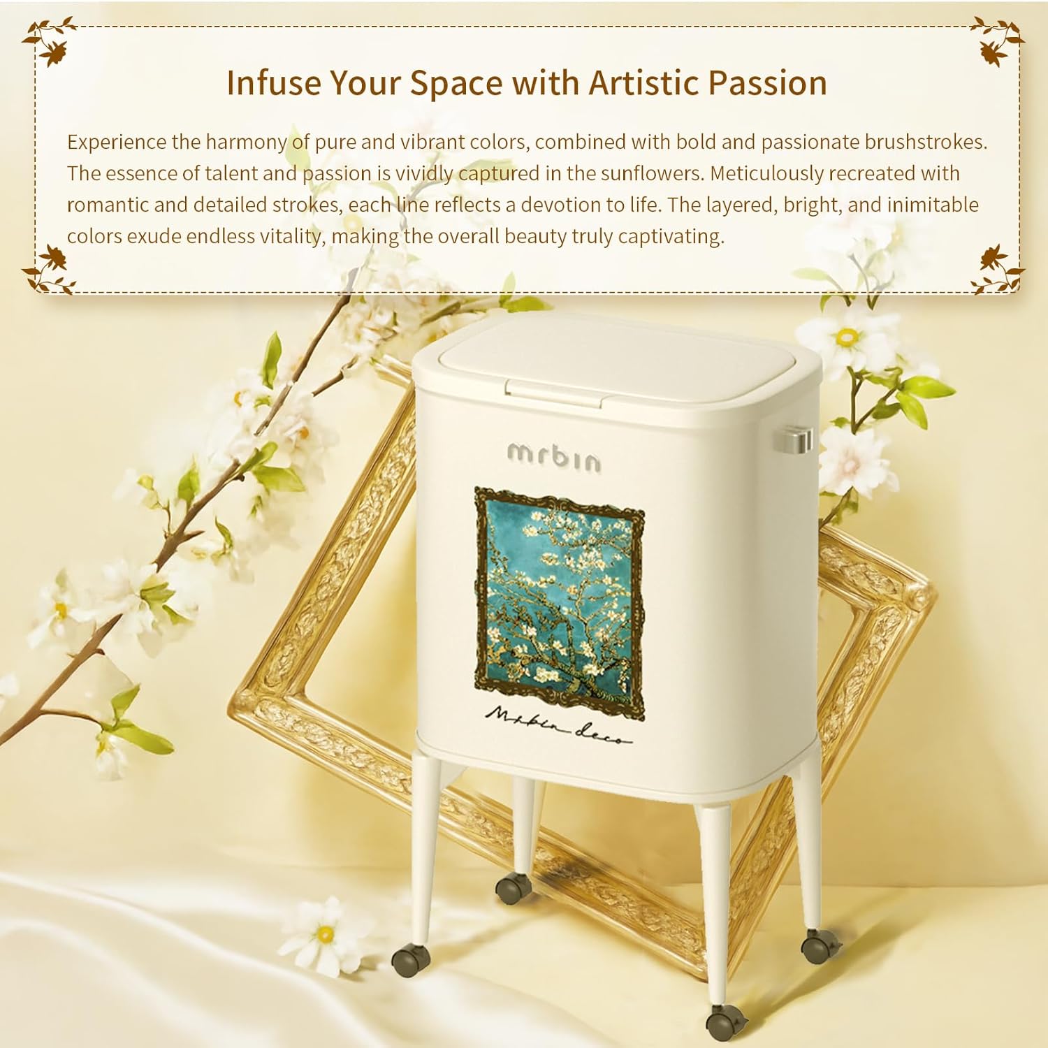 - Artistic Aesthetic in Decor: This decorative trash can features a classic apricot blossom pattern, embodying a sophisticated touch with art-framed paint ornaments. It reflects a taste for art and attitude in home decoration, blending seamlessly into any room's aesthetic.