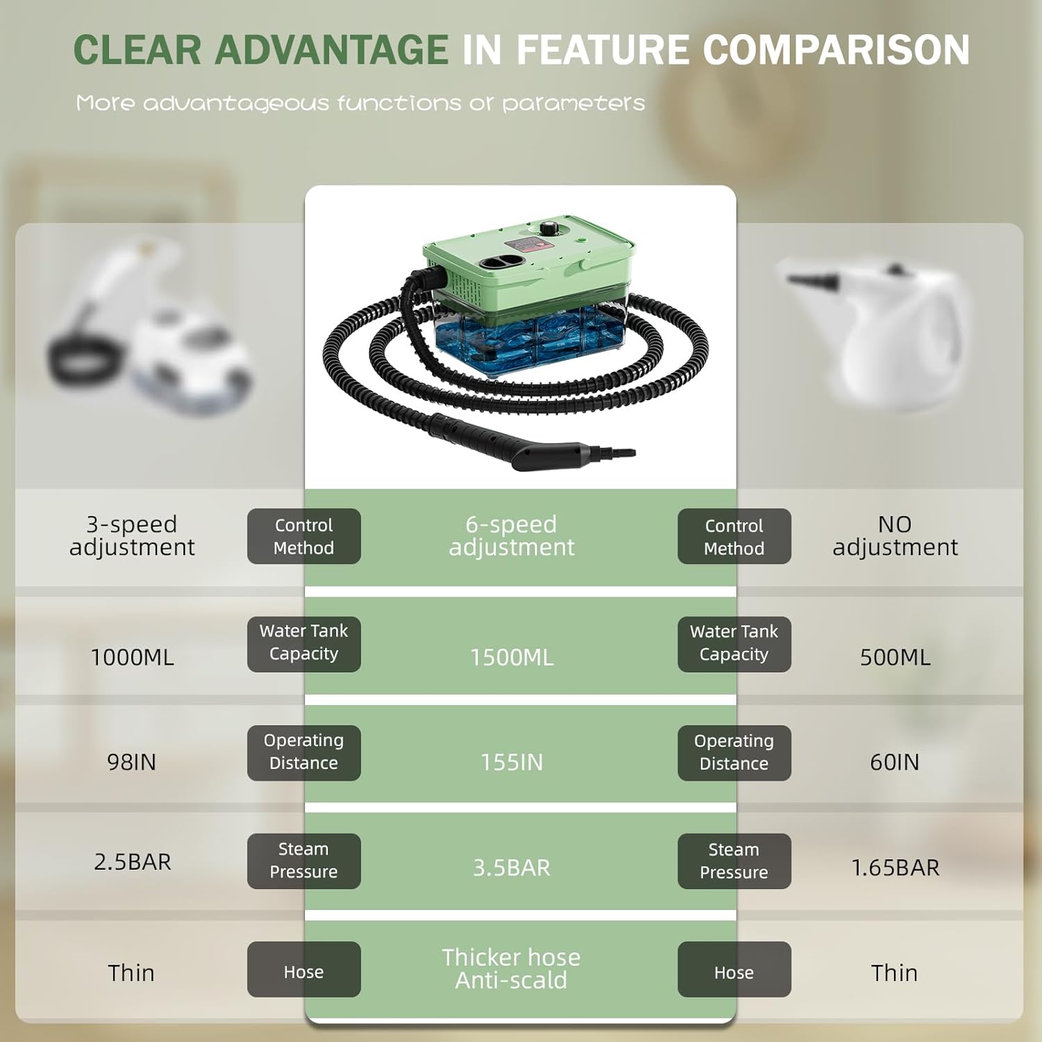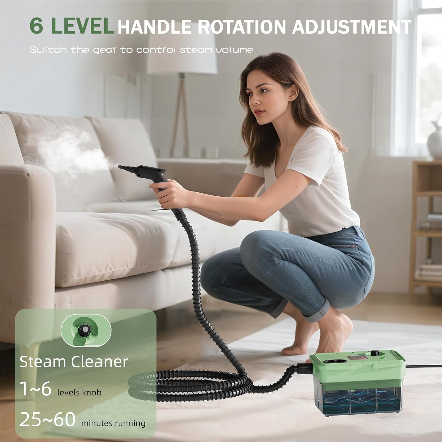 - 6 Adjustable Steam Levels: Customize your clean with 6 precision steam settings!This flexibility ensures you get the perfect steam output for your specific cleaning needs.Use low steam for delicate surfaces (e.g., curtains,car seats) and high pressure for tough jobs (e.g., greasy stoves,bathroom grout).The ergonomic grip make operation effortless.