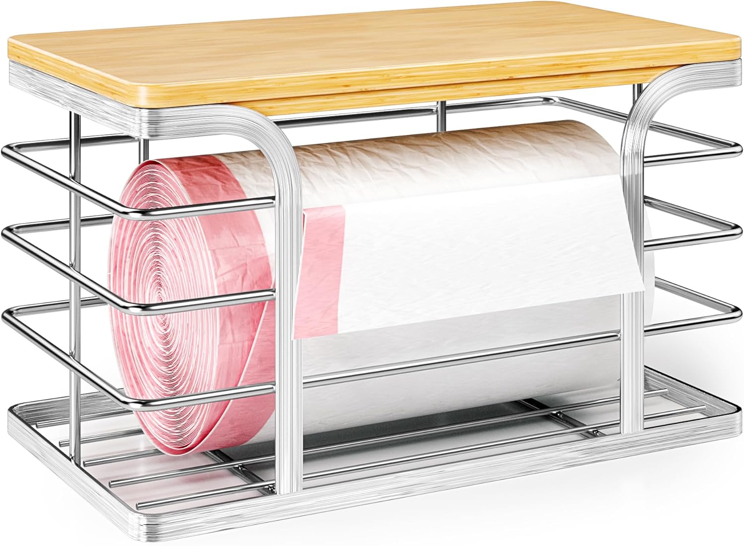 Trash Bag Holder with Bamboo Top, Wall Mount 304 Stainless Steel Garbage Bag Dispenser,Stackable Storage for Kitchen Laundry Organization,Silver Small