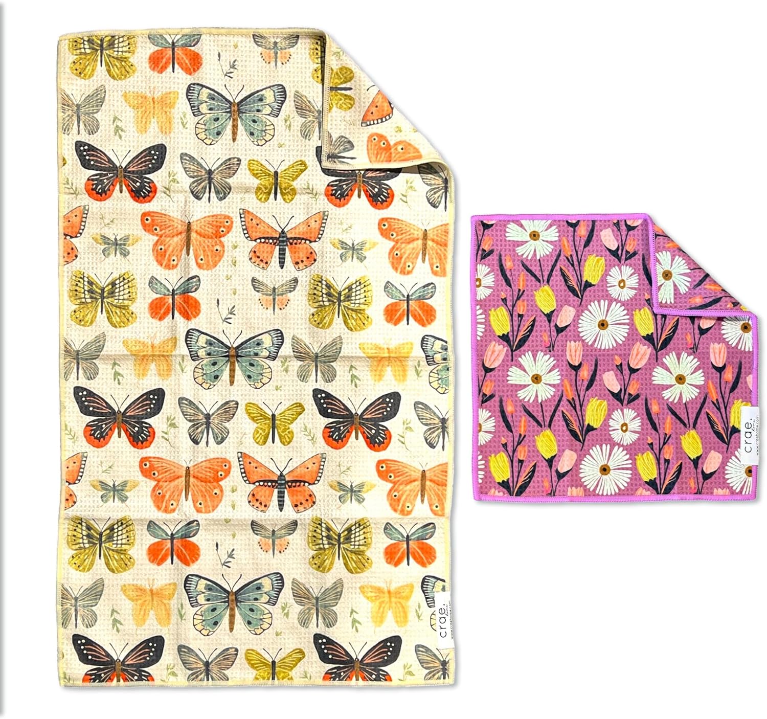 Microfiber Hand Towel & Washcloth Set of 2 - Double-Sided, Waffle Weave, Super Absorbent, Lint-Free, Fast Drying - Wings & Flower Farm Pattern for Bathroom, Kitchen, Car, and Window Cleaning