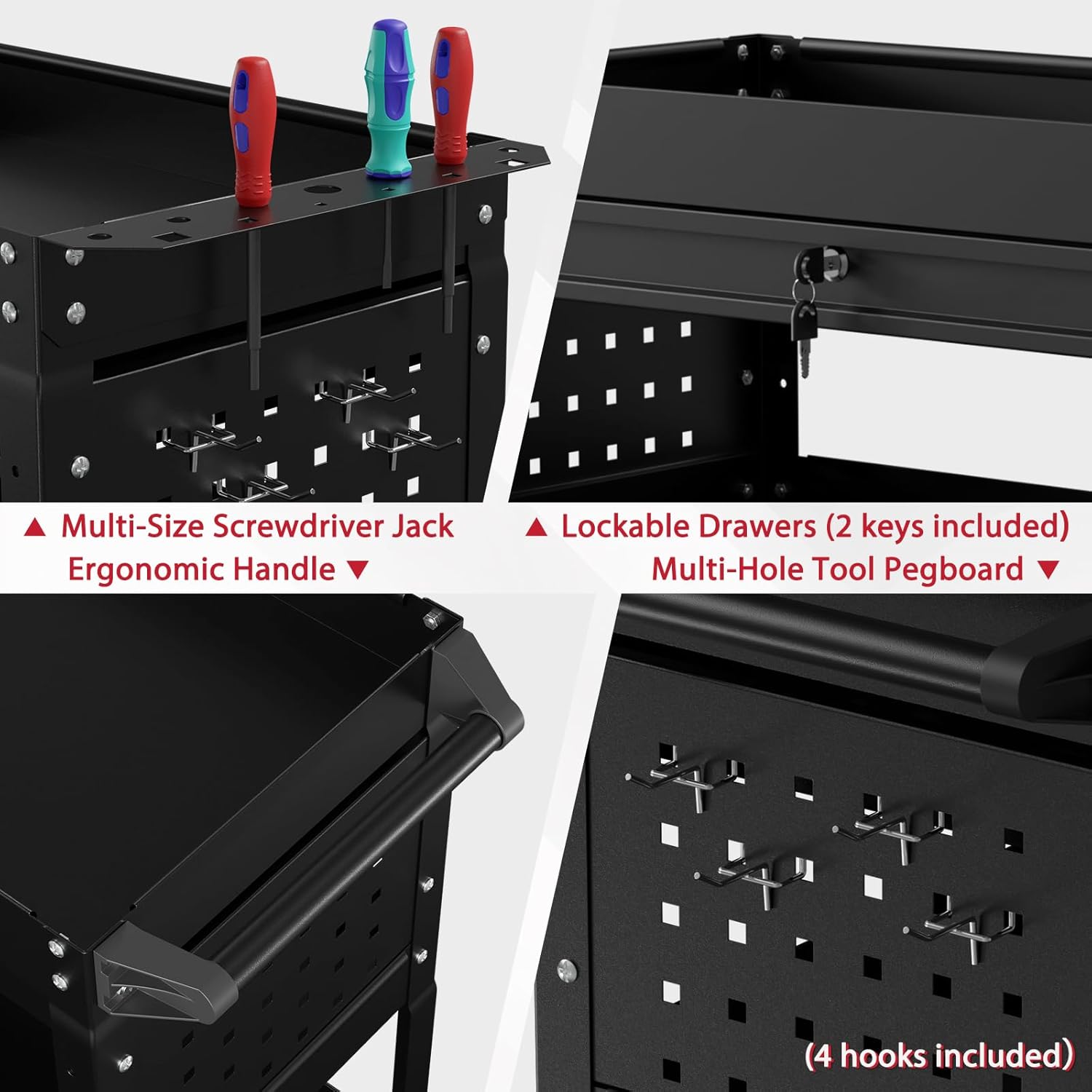 - š§°ćVersatile Applicationsć: The rolling cart with drawers can help you easily store or transport tools, boxes, supplies, heavy items, etc. Whether you're a DIY enthusiast, a professional tradesman, or a hobbyist, this tool cart's versatile design adapts to a wide range of tasks and projects.