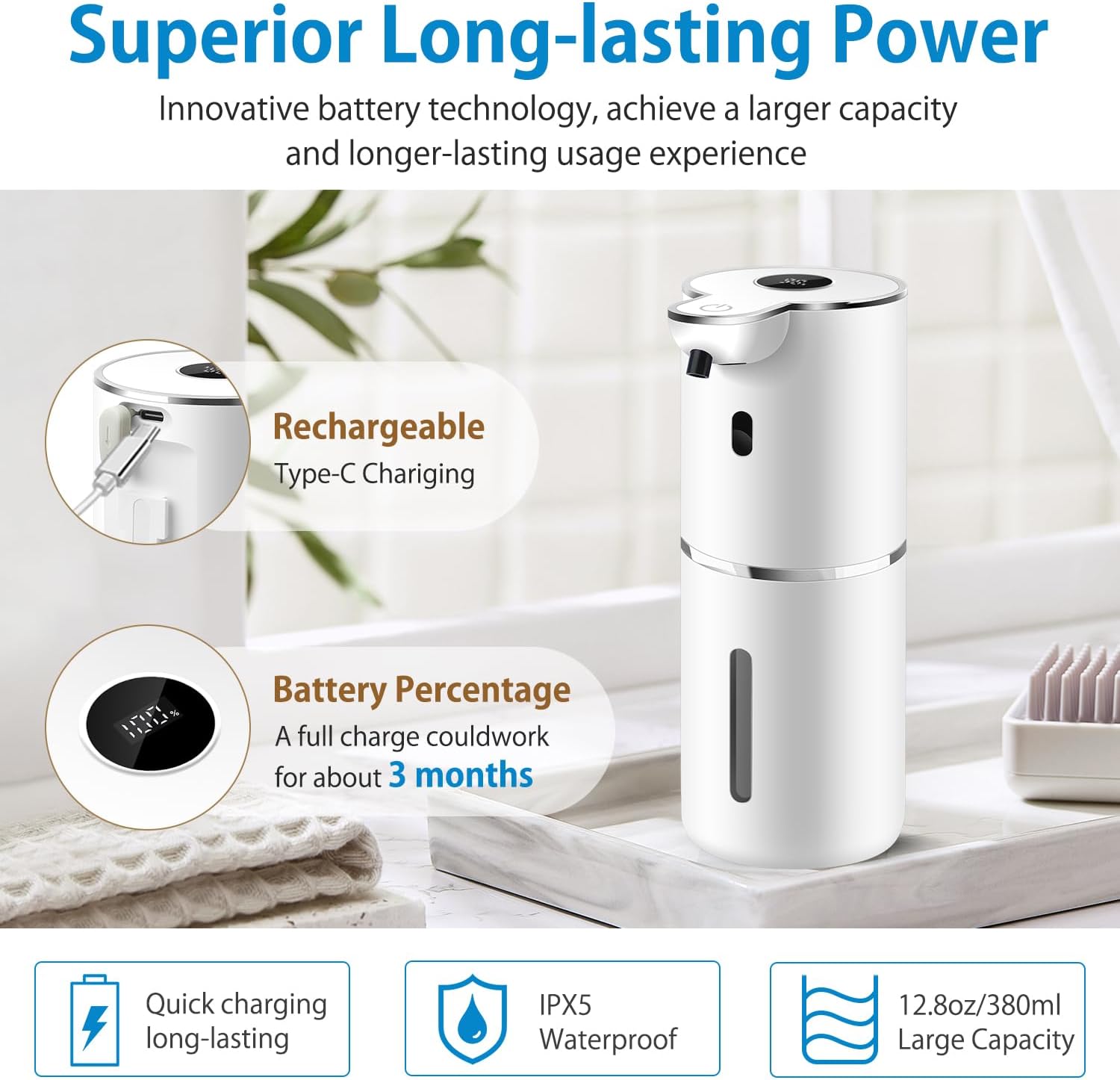 - 【6 Levels of Foam Dispensed】We understand that everyone has different need for soap lather. With our user-friendly design, you can effortlessly adjust the foaming level to suit your needs. By pressing the power button, choose different soap level. Not only does this feature cater to different need, but it also helps prevent soap waste, ensuring an efficient and satisfying experience