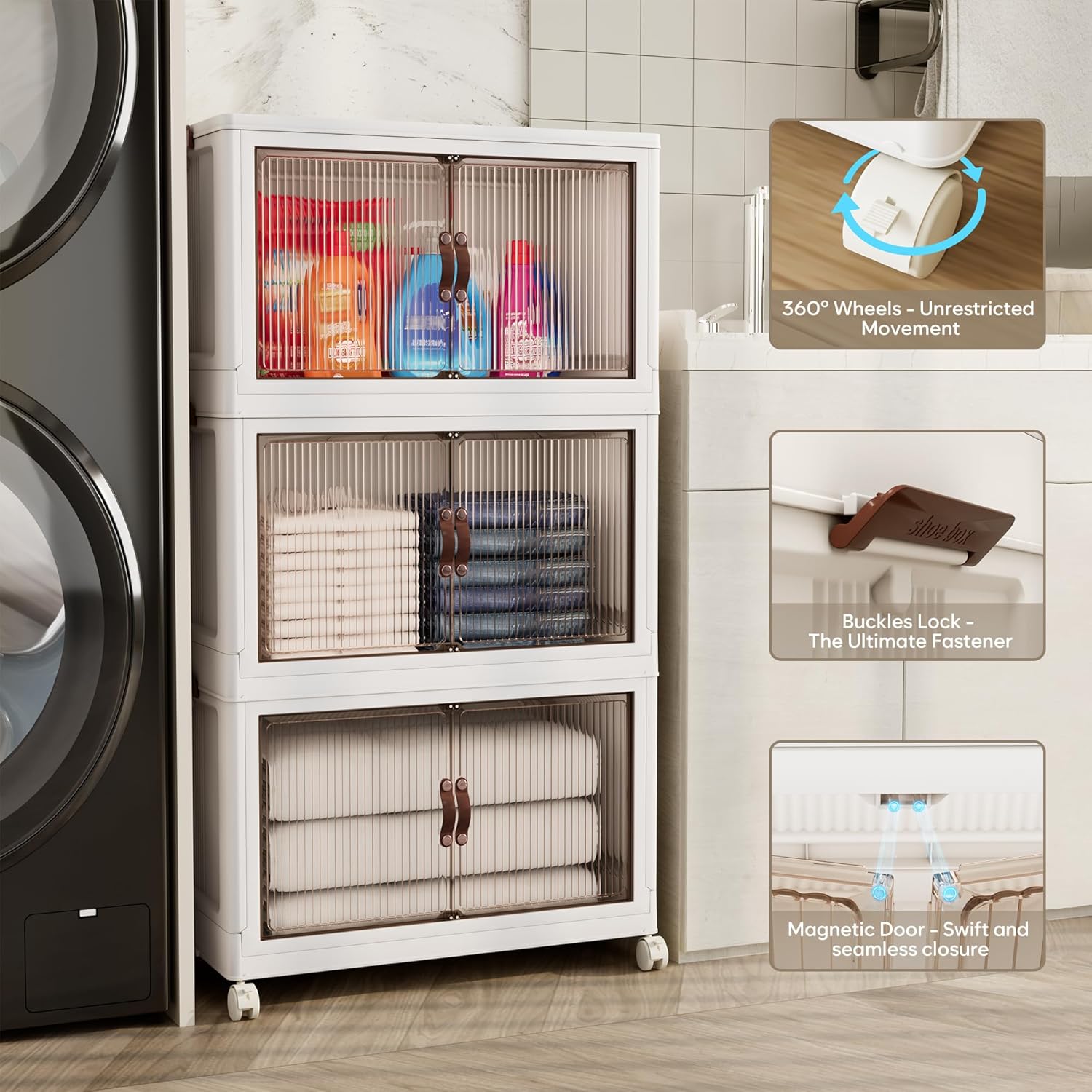 - 【Magnetic Doors & Rotating Wheels】The bins offer two opening options: front or top. The magnetic closure allows easy access. The 4 rotating 360-degree wheels make them easy to move, ideal for use in storage and organization in any room like your closet or bathroom.
