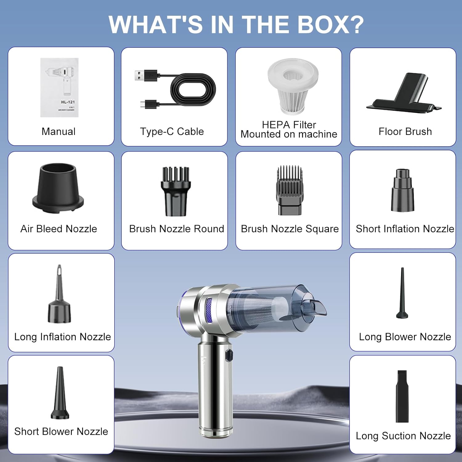 - Included Components : Cleaning Brushes, Filter Cartridge, Main Vacuum Unit, Multiple Nozzle Attachments, Usb-c Charging Cable Cleaning Brushes, Filter Cartridge, Main Vacuum Unit, Multiple Nozzle Attachments, Usb-c Charging Cable